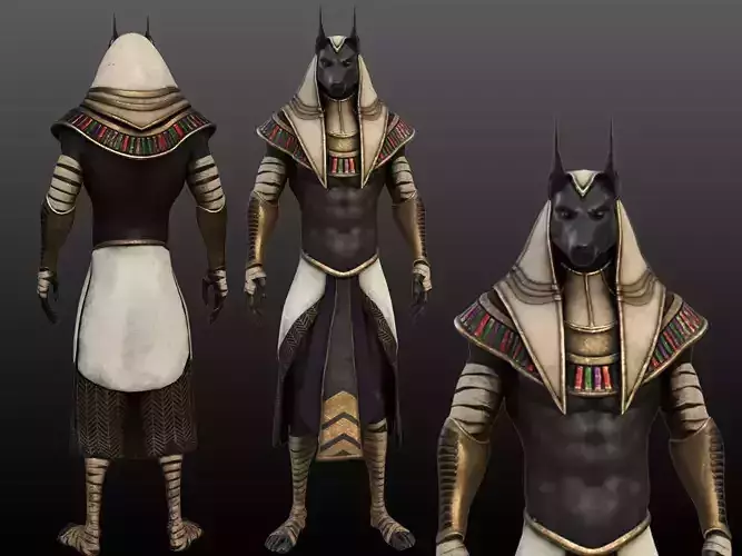 A high-quality 3D model of the Egyptian God Anubis featuring detailed sculpting, realistic materials, and accurate ornamental elements inspired by ancient Egyptian design. Suitable for games, cinematics, historical visualizations, mythology scenes, and real-time or offline rendering projects.