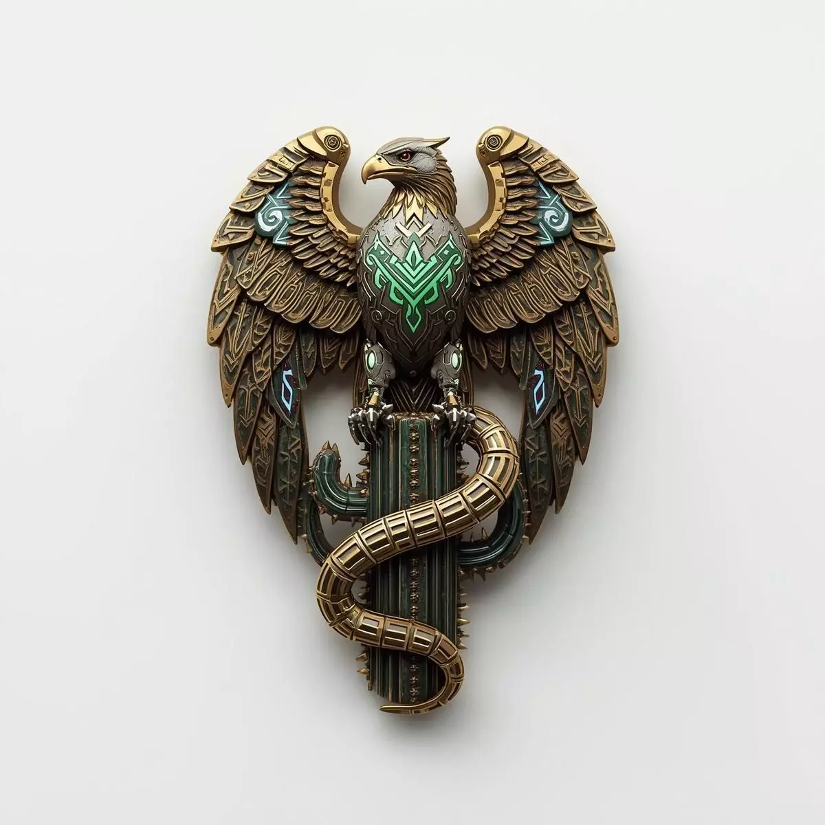 TagsEmblem Eagle Mexico SciFi Futuristic Mechanical Bronze Gold Green Red Prop GameAsset Detailed 3DModel Sculpture NationalSymbol Snake Cactus GoldenEagle