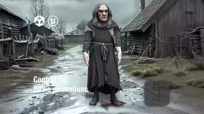 Game-ready character asset for real-time engines: strong silhouette, readable cloth folds, and gritty materials that fit gloomy atmospheres for games, cinematics, and promotional renders.Stylized realistic elderly witch/hag character with long gray hair, deeply wrinkled face, and a harsh, intimidating expression. Dressed in a worn dark peasant robe with a simple rope belt, layered shawl, and plain boots—ideal for dark fantasy, folk horror, medieval village scenes, and storyline NPC roles.
