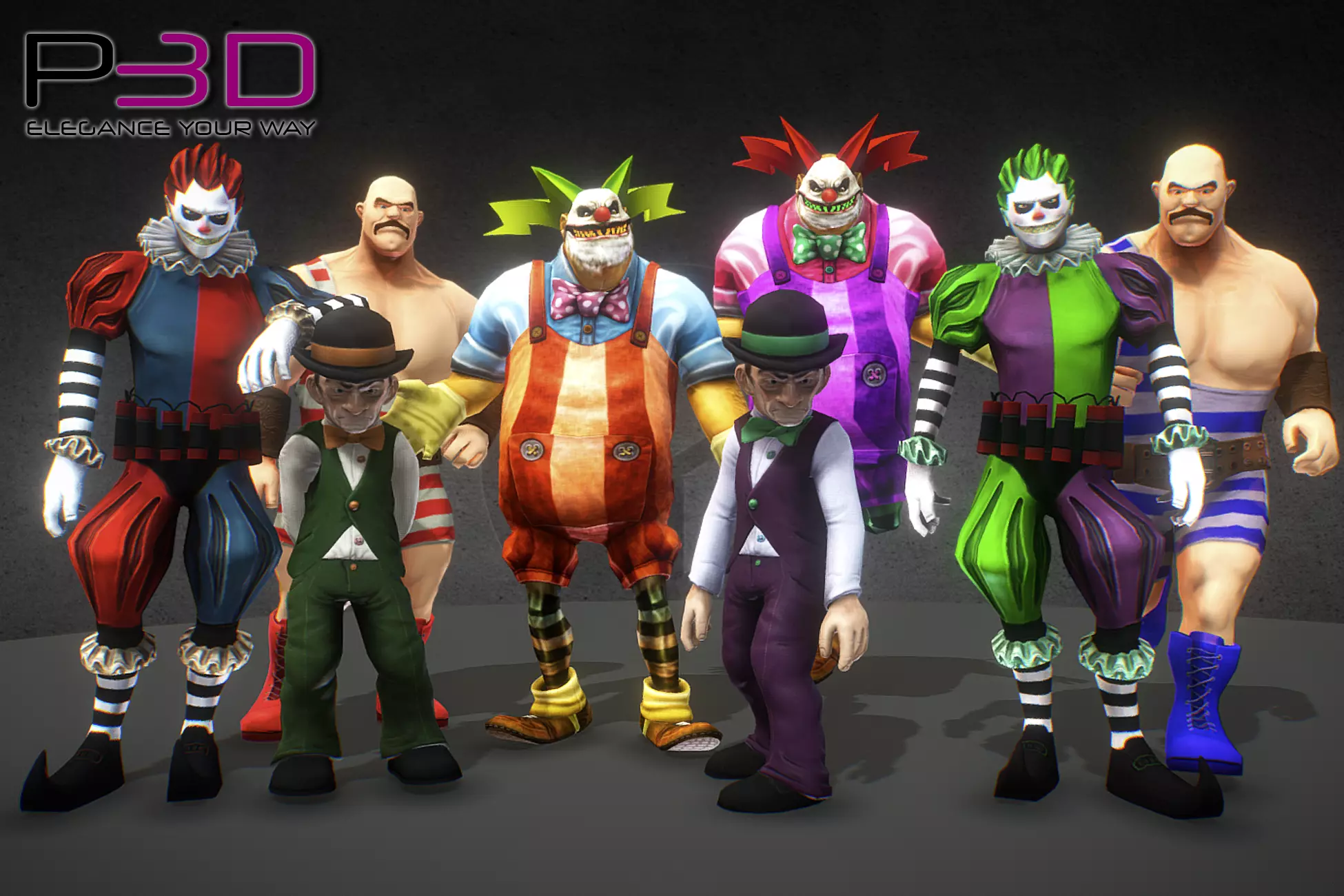 • Four models: Clown (6600 triangles), Juggler (4800 triangles), Strongman (4000 triangles), Oldman (4500 triangles).