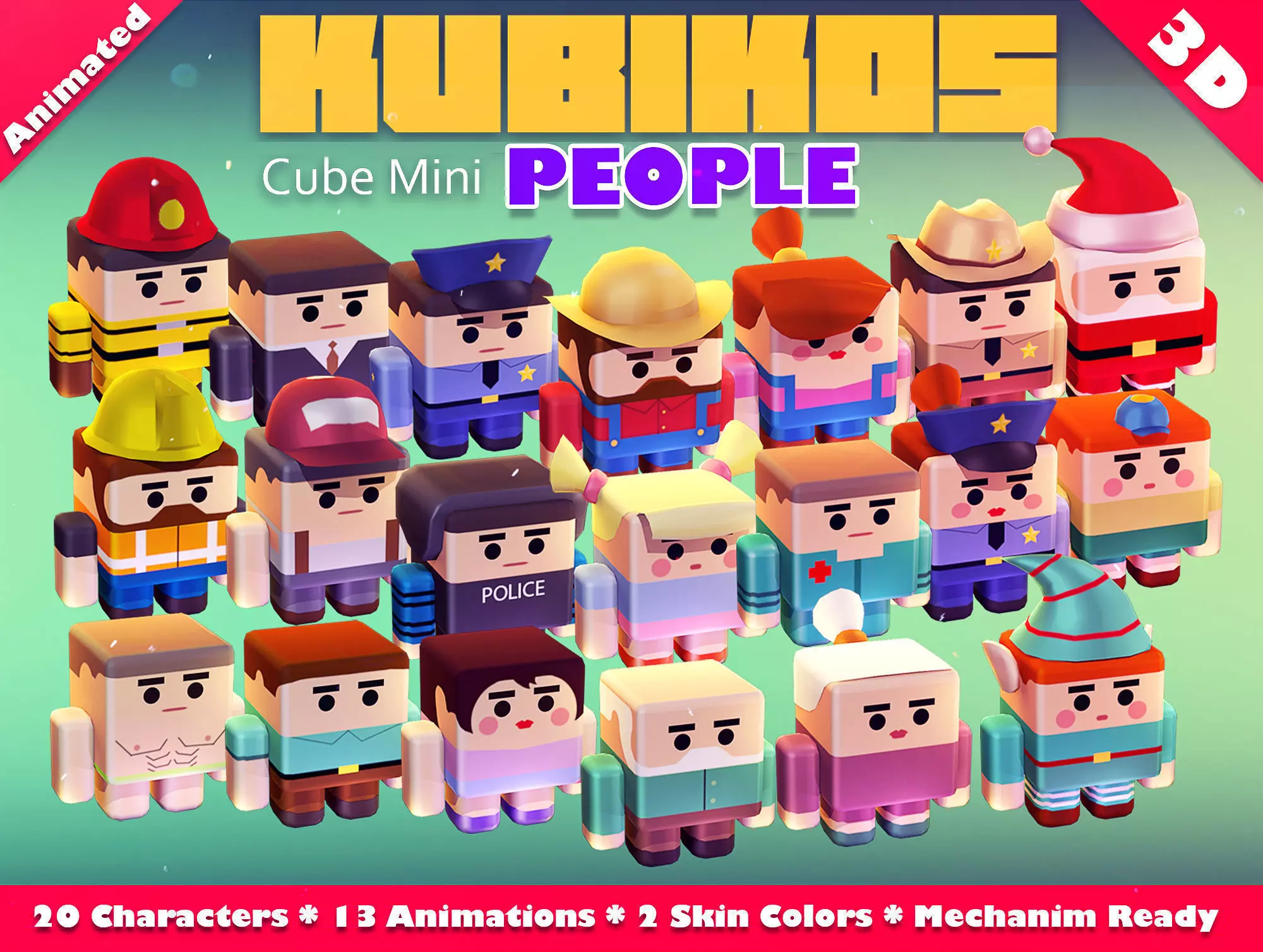 KUBIKOS People – is a collection of 20 different cute low poly mobile game friendly Human Characters! Each character comes with their own animation set and 2 different skin colors. Perfect collection for your game!