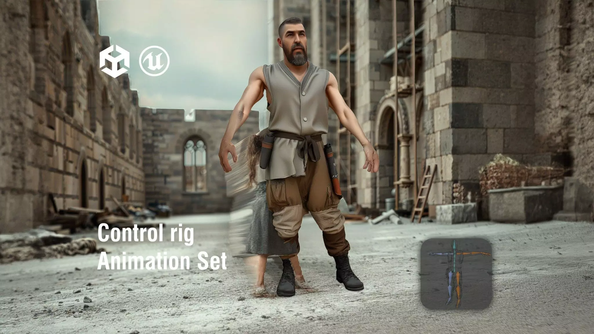 This model features a full-body medieval stonemason character, designed with realistic details and textures. Each model has 3 levels of detail with QUAD polygons: