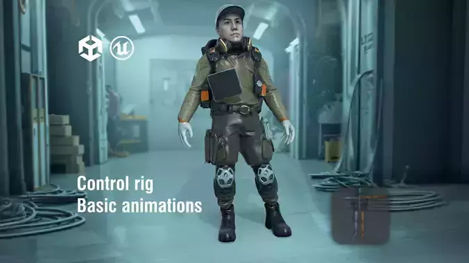 Includes multiple idle, walk, run, and jump animations as FBX files for Unity and Unreal Engine, easy to apply to this character. It's full compatible with Mixamo RIG.This character model comes in 3 levels of detail: low-poly for mobile games, mid-poly for standard games, and high-poly for cinematics. The model is fully rigged and ready for animation. It includes PBR textures (4096x4096), including diffuse, normal maps, and metallic/roughness maps. The character is provided in T-pose and can be easily imported into any modern game engine or 3D software. Perfect for games, animations, or virtual reality applications. Please like and comment if you find this model useful!A practical robot maintenance technician with average athletic proportions and a clean, readable silhouette, lightly oil-stained skin, and a focused expression; short hair under a hard cap with a flip-down visor, and a compact respirator resting at the neck; wearing layered workwear with a fitted undersuit, reinforced utility jacket, padded knee work pants, and scuffed magnetic boots, with grime and grease at cuffs and seams; spare actuator modules and cable cartridges secured in a backpack frame, a diagnostic tablet holstered on the thigh, and a compact tool roll clipped to the belt, plus a spare sensor housing attached to the shoulder strap. In an industrial service bay with a maintenance gantry, coiled cables on the floor, and cool white overhead lighting with soft haze; “Full-body, centered, fully visible in frame; standing upright in a T-pose with arms extended straight out to the sides; palms facing the camera (open palms); hands empty; match the provided OpenPose reference; PBR-friendly materials.”.