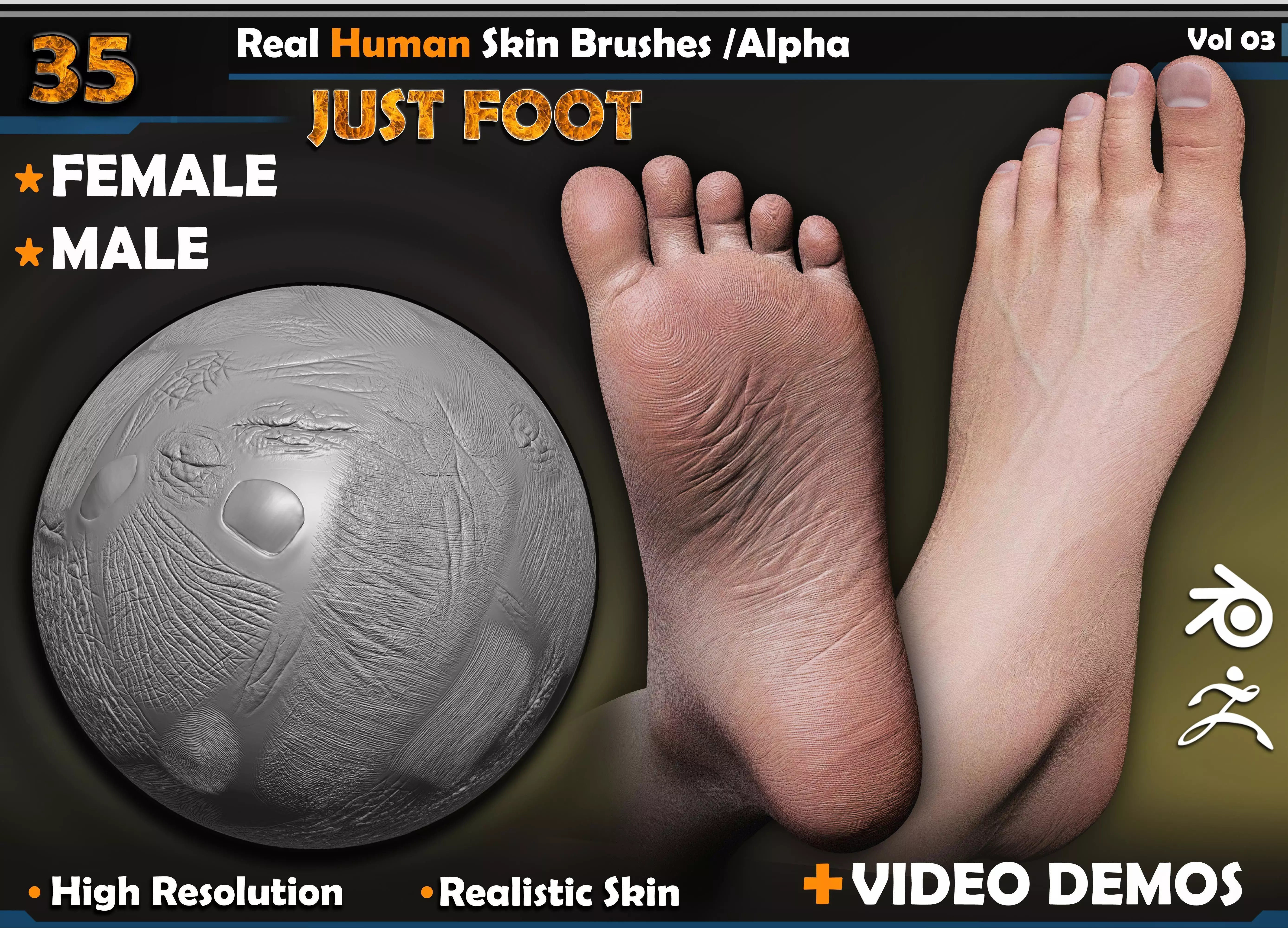 This Product include 35 Real Human Skin Brushes /Alpha Vol 03This product includes 35 high-quality brushes and alphas created from real human hand skin, designed with precision and realism. These brushes are perfect for adding natural skin details to both male and female Foots. Simply adjust the depth of the brush strokes, as female hand details often require a lighter depth.