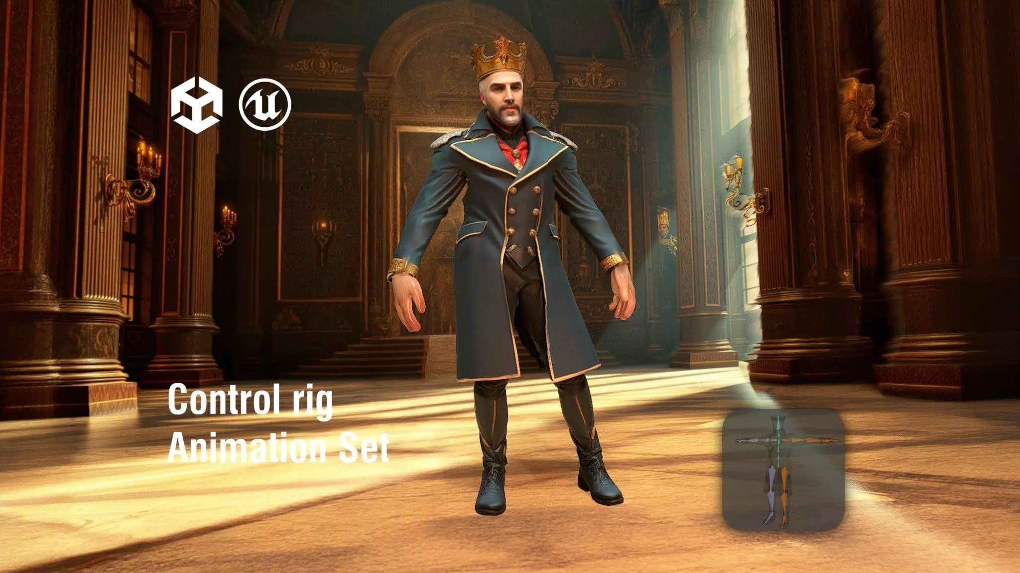 This model features a full-body character of a regal ruler, showcasing an authoritative presence with sharp eyes and well-groomed hair. The elegant coat and polished boots highlight the character's royal status. Each model has 3 levels of detail with QUAD polygons: