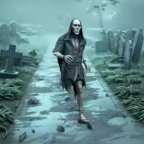 A revenant (one head, one torso, two arms, two legs) with a grim, corporeal presence has pale stretched skin over sharp bones, bruised veiny hands, and cold ember-like eyes, with visible old wounds and stitched tears in the flesh, wearing a dirt-caked burial shirt under a battered half-cuirass and torn cloak, with broken shackles and a grave-tag pendant hanging from the neck and a rusted short blade sheathed at the hip, standing in a rain-soaked graveyard path with muddy puddles, leaning headstones, and low fog. Full-body, centered, fully visible in frame; standing upright in a T-pose with arms extended straight out to the sides; palms facing the camera (open palms); hands empty; PBR-friendly materials.Included animation of Idle, Walking, Running etc. It's full compatible with Mixamo RIG.