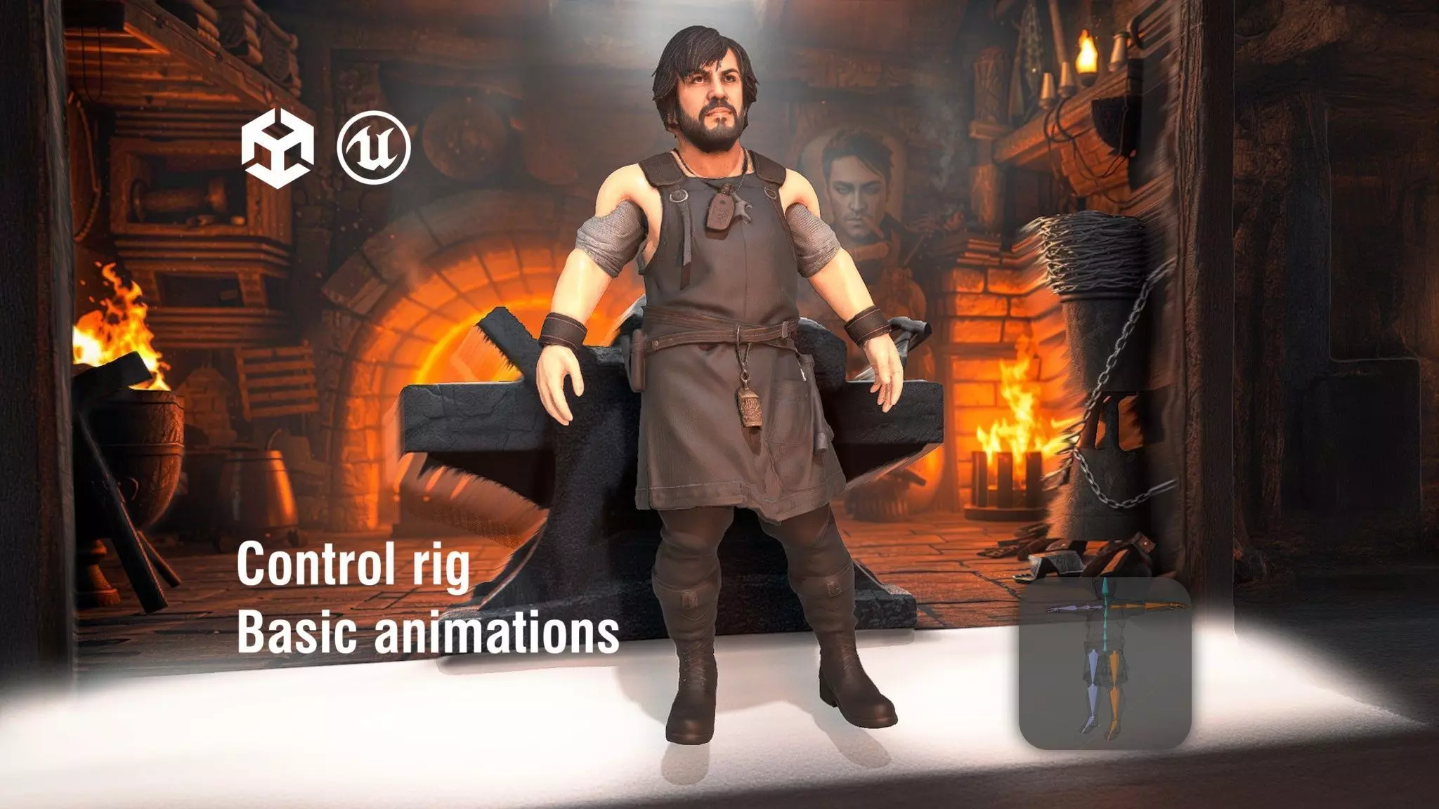Includes multiple idle, walk, run, and jump animations as FBX files for Unity and Unreal Engine, easy to apply to this character. It's full compatible with Mixamo RIG.This character model comes in 3 levels of detail: low-poly for mobile games, mid-poly for standard games, and high-poly for cinematics. The model is fully rigged and ready for animation. It includes PBR textures (4096x4096), including diffuse, normal maps, and metallic/roughness maps. The character is provided in T-pose and can be easily imported into any modern game engine or 3D software. Perfect for games, animations, or virtual reality applications. Please like and comment if you find this model useful!A rugged 42-year-old male blacksmith with a stocky build, shaggy black hair streaked gray, wears scorched leather apron over a coarse brown tunic and heavy boots, his scarred face set in focused determination with a iron hammer pendant necklace. He stands in a dimly lit medieval forge amid glowing orange furnaces, anvil cluttered with red-hot tongs, wooden rafters hung with chainmail, sparks flying through smoky air under flickering torchlight and crackling hearth flames.. White background. Realistic colorized model. In the middle. Full body view. T POSE with arms spread to the sides, straight arms, front view. Professional lighting. Soft shadows. Include the described environment and all visual details for a complete scene.
