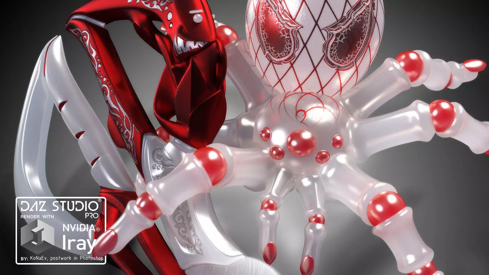 This props for Daz Studio created in Zbrush, fully rigged scissor with ornamented handles and specifically inspired spider, will good fit your fantasy, cartoon or maybe horror work.Scissor-Blade you can use as some fantasy weapon or toy, this true for Mimic-Spider as well. Each prop have 2 pose and single Iray material preset.