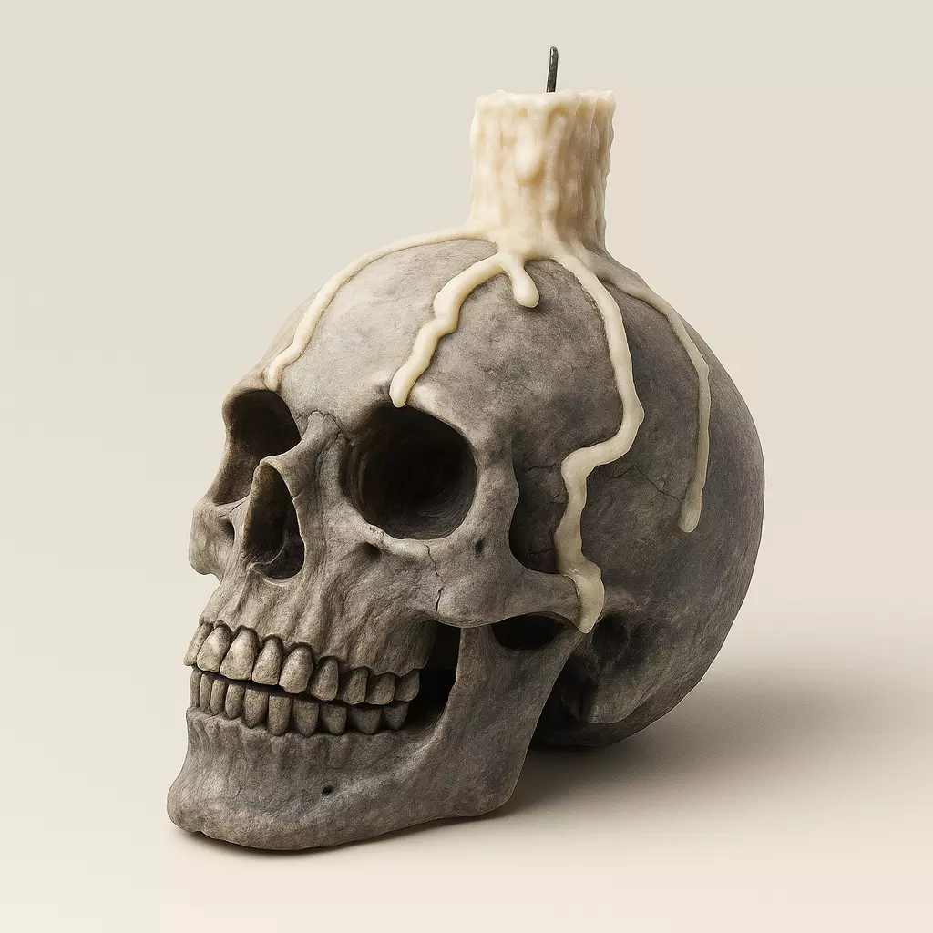 Rendered with realistic PBR materials, the candle wax appears soft and semi-translucent, contrasting against the coarse, aged texture of the skull beneath. The subtle interplay of light and shadow across the bone surface gives an almost tangible sense of depth and realism. This piece evokes the spirit of haunted chambers, ancient rituals, and forgotten altars where illumination and death coexist in eternal balance.