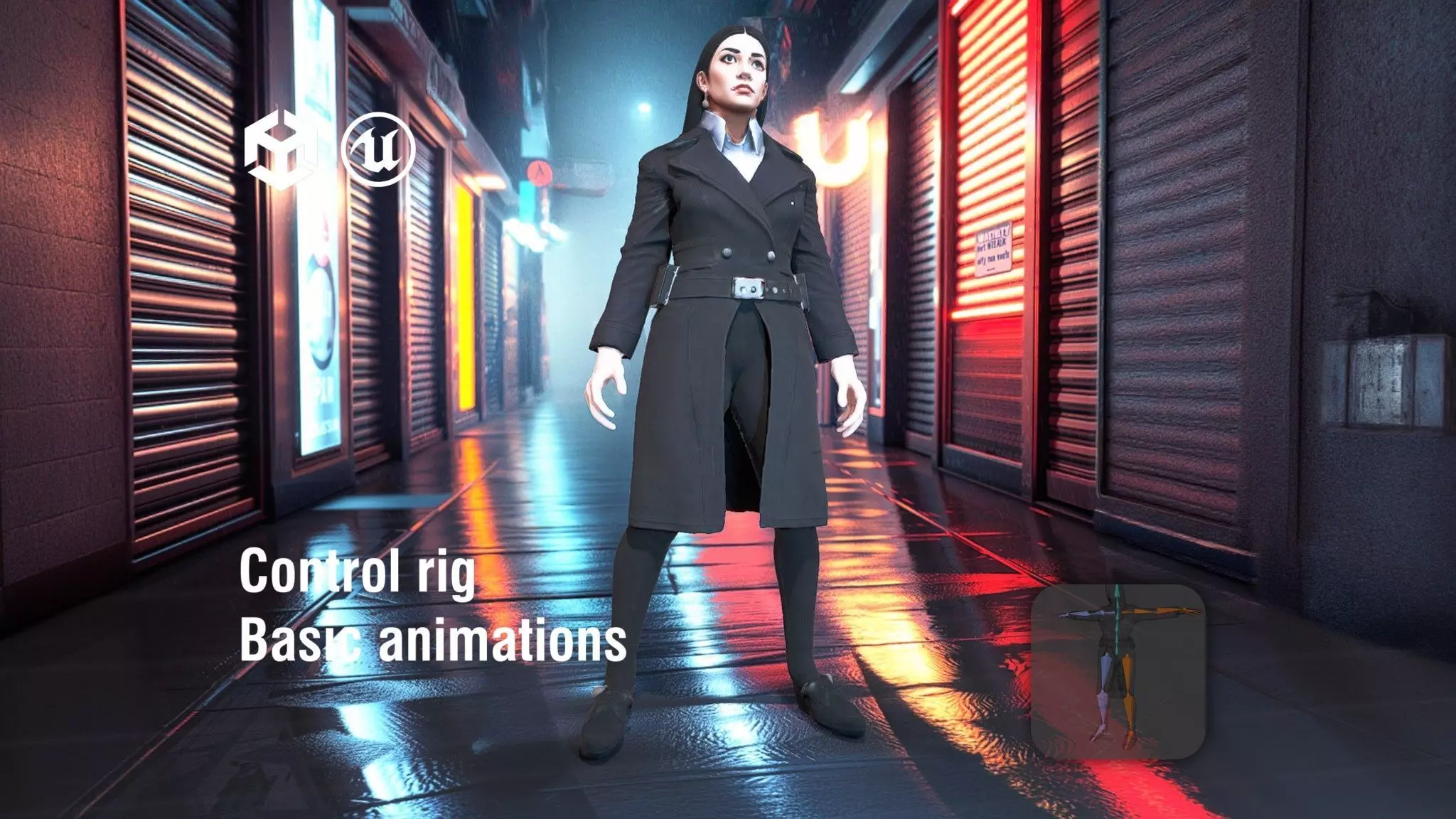 Includes multiple idle, walk, run, and jump animations as FBX files for Unity and Unreal Engine, easy to apply to this character. It's full compatible with Mixamo RIG.This character model comes in 3 levels of detail: low-poly for mobile games, mid-poly for standard games, and high-poly for cinematics. The model is fully rigged and ready for animation. It includes PBR textures (4096x4096), including diffuse, normal maps, and metallic/roughness maps. The character is provided in T-pose and can be easily imported into any modern game engine or 3D software. Perfect for games, animations, or virtual reality applications. Please like and comment if you find this model useful!A sleek corporate field agent with tall, precise proportions and a sharp, minimalist silhouette, composed posture, and an unreadable expression; neatly styled hair, a single head with subtle facial implant seams near the jawline, and a faint glow from a temple data port; wearing smart tailored clothing with layered tech-fabric trench coat over a fitted sensor-weave suit, conductive seam lines, and polished shoes with hidden ankle holsters, kept mostly clean with slight rain speckling; a compact surveillance micro-drone hovering nearby at shoulder height, a slim encrypted comms module clipped to the belt, and a concealed med-injector and spare drone battery mounted on an inner harness, not held. In a rainy neon-lit alley with wet concrete reflections, a single parked service door, and cool rim light cutting through mist, no crowds or readable signs; “Full-body, centered, fully visible in frame; standing upright in a T-pose with arms extended straight out to the sides; palms facing the camera (open palms); hands empty; match the provided OpenPose reference; PBR-friendly materials.”.