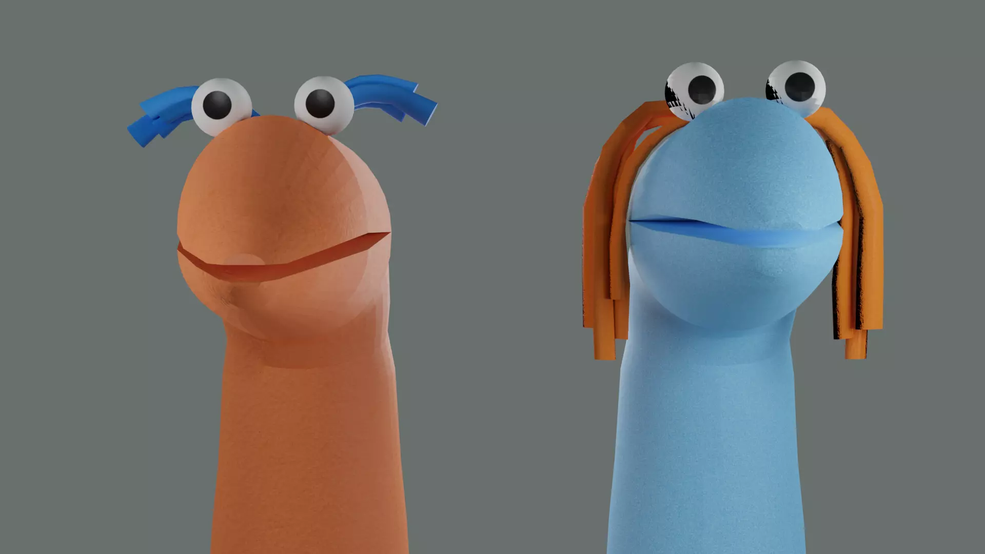 Two sock puppets, fully rigged and textured. Files included are FBX, OBJ, texture images, and preview images. Fully rigged and modeled in Blender. Textured in Quixel Mixer. Rendered in Cycles in Blender. Rigs are good for animation, practice, or just for general fun.