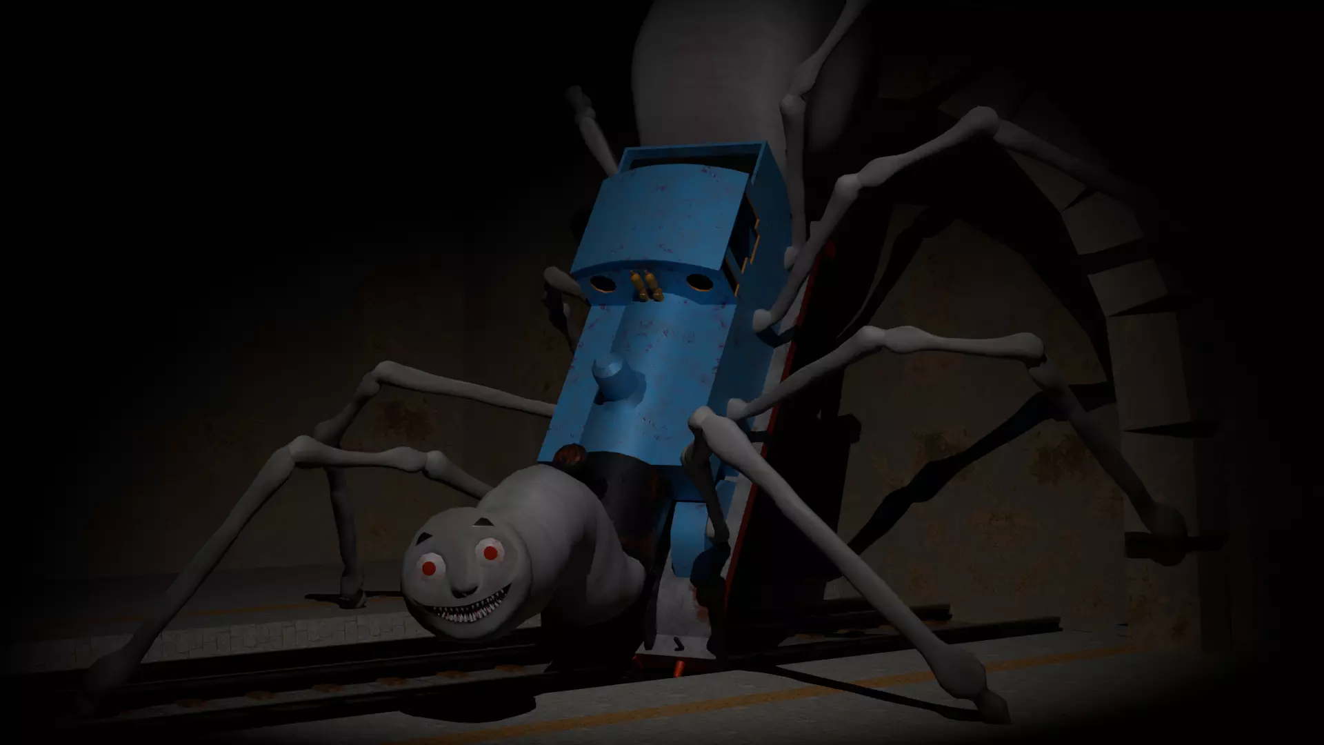 The main shape of Thomas the Tank Engine is preserved, but spider elements such as eight long, curved legs are added, attached to the sides of the body. The model has a bone rig, allowing flexible control of the leg movements and other parts of the body. One of the files includes a creepy scene with animation, where Spider Thomas the Tank Engine is locatad at the train station.