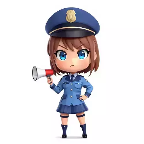 Add a sense of authority and charm to your digital world with this high-quality 3D model of a stylized chibi anime police officer. The character is dressed in a detailed blue law enforcement uniform, complete with a pleated skirt, tactical boots, and a matching officer’s cap featuring a gold emblem. Captured with a determined expression and blue eyes, she holds a megaphone, making her an ideal character for interactive gameplay or narrative-driven scenes.