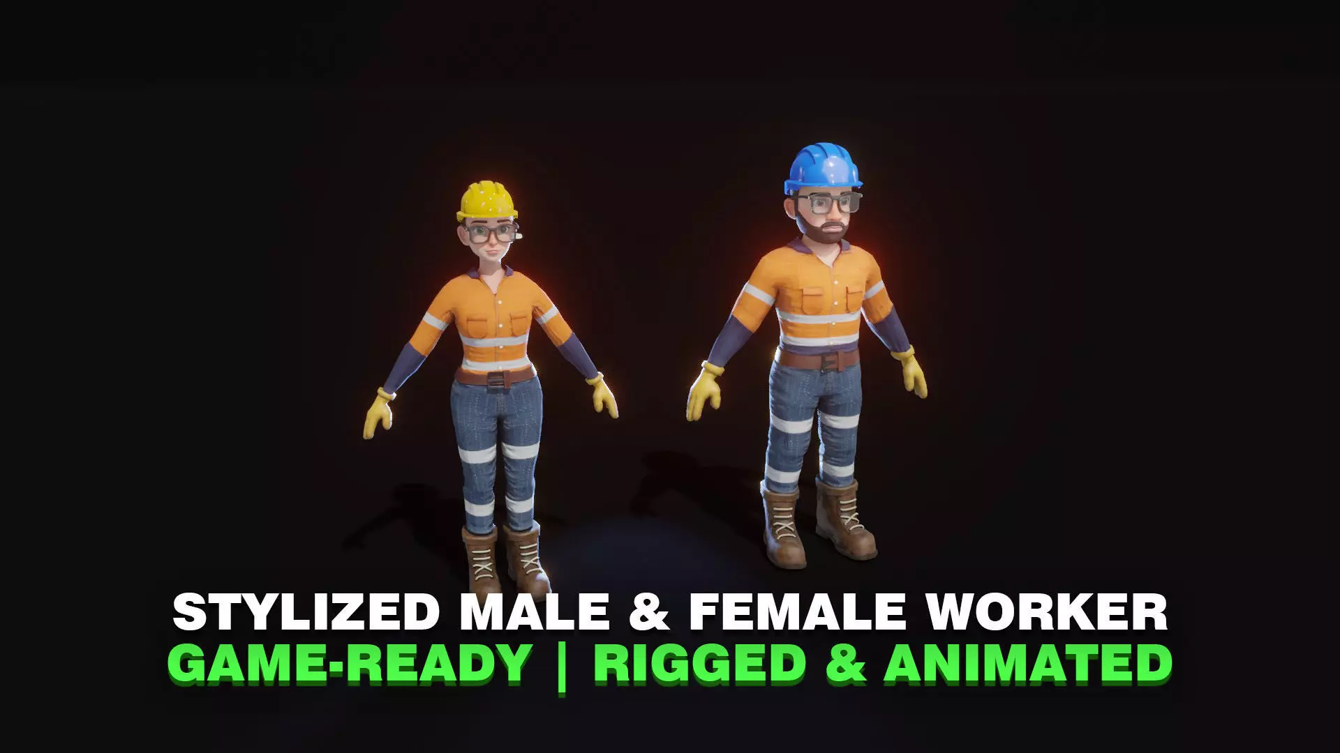Stylized Male & Female Worker 3D Model – Animated & Customizable includes male & female characters with rig & 14 animations (idle_standing, walk, run, talk, pick_up, carry, point, sit_down, get_up, idle_sitting, wave, write, type, drive) & facial rig.