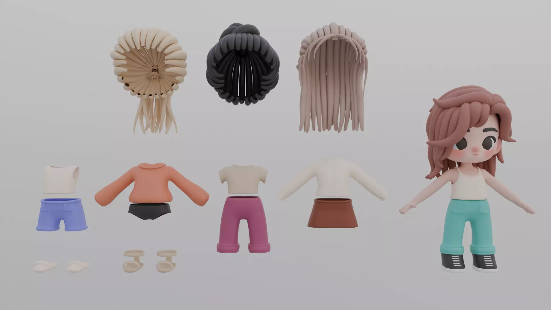 Stylized Modular Cute Character Pack - Game ReadyEasily create dozens of character variations from a single base! This modular character pack includes a stylized character mesh and multiple intercheangable outfit and hairstyle parts - perfect for game enginies and animation. All meshes are fully UV unwrapped and include base color textures. No rig included.