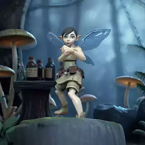 A tiny fairy pixie alchemist (one head, one torso, two arms, two legs) with delicate humanoid proportions, pointed ears, and bright curious eyes has translucent insect-like wings folded behind the back, wearing a short fitted tunic with stitched seams, soft boots, and a utility belt covered in miniature corked glass vials and potion straps, with tiny satchels and charms clipped at the hips, standing on a mossy tree-stump workbench in a twilight forest glade with oversized mushrooms, dew-lit leaves, and soft bioluminescent glow. Full-body, centered, fully visible in frame; standing upright in a T-pose with arms extended straight out to the sides; palms facing the camera (open palms); hands empty; PBR-friendly materials.Included animation of Idle, Walking, Running etc. It's full compatible with Mixamo RIG.