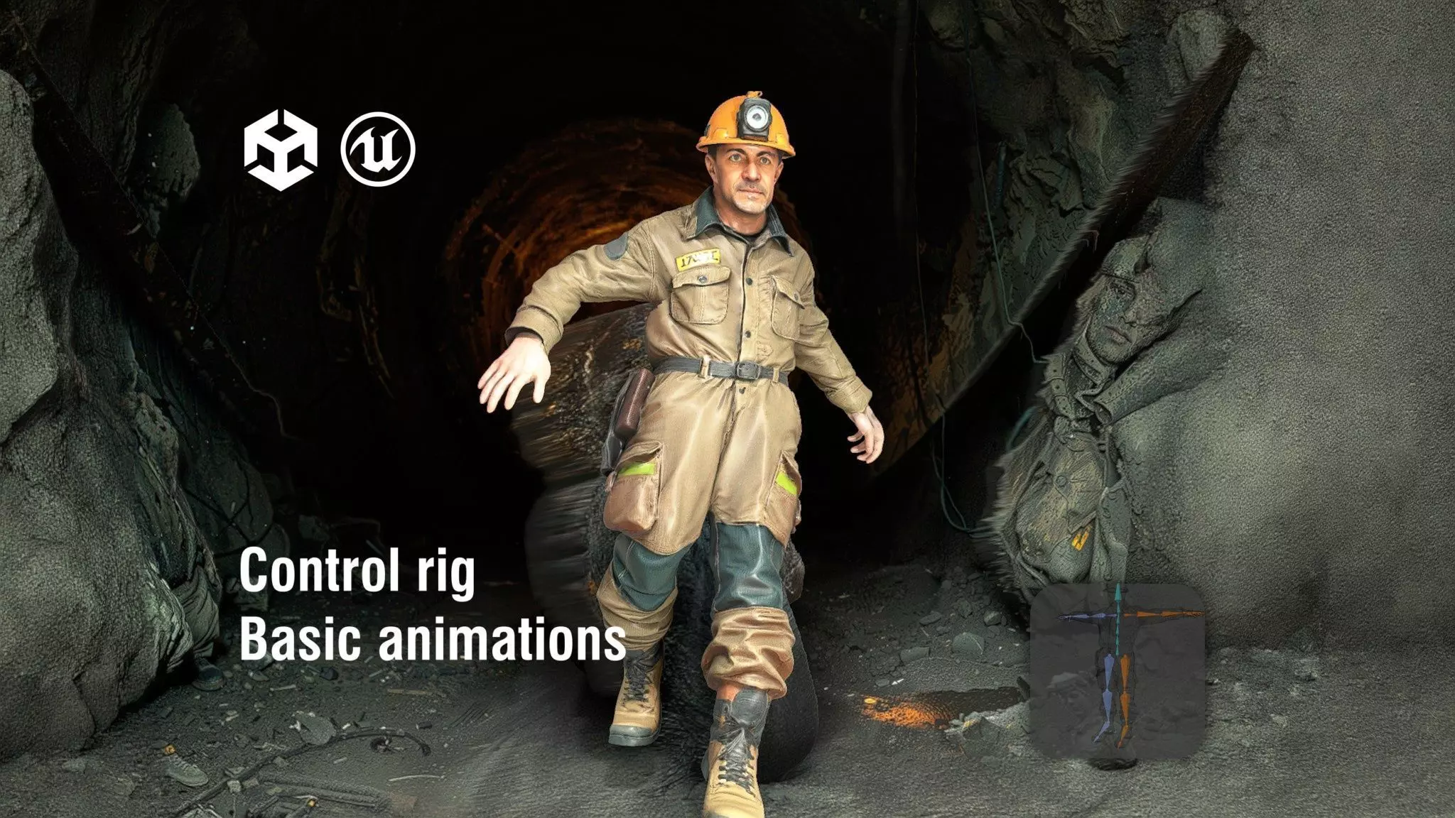 Included animation of Idle, Walking, Running etc. It's full compatible with Mixamo RIG.This character model comes in 3 levels of detail: low-poly for mobile games, mid-poly for standard games, and high-poly for cinematics. The model is fully rigged and ready for animation. It includes PBR textures (4096x4096), including diffuse, normal maps, and metallic/roughness maps. The character is provided in T-pose and can be easily imported into any modern game engine or 3D software. Perfect for games, animations, or virtual reality applications. Please like and comment if you find this model useful!An underground miner wears a dusty, grease-stained heavy work coverall with reinforced seams and reflective strips, a hard hat fitted with a bright headlamp, and rugged steel-toe boots, his face smeared with coal dust and sweat with tired determined eyes, standing inside a dim mine tunnel with rough rock walls, timber supports, hanging cables, drifting dust in the air, and the faint glow of work lights reflecting off damp ground; pose: standing upright in a T-pose with arms extended straight out to the sides, palms facing the camera (open palms), hands empty.