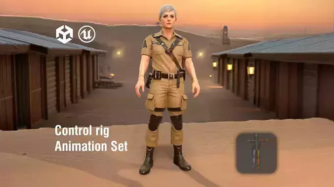 Includes multiple idle, walk, run, and jump animations as FBX files for Unity and Unreal Engine, easy to apply to this character. It's full compatible with Mixamo RIG.This character model comes in 3 levels of detail: low-poly for mobile games, mid-poly for standard games, and high-poly for cinematics. The model is fully rigged and ready for animation. It includes PBR textures (4096x4096), including diffuse, normal maps, and metallic/roughness maps. The character is provided in T-pose and can be easily imported into any modern game engine or 3D software. Perfect for games, animations, or virtual reality applications. Please like and comment if you find this model useful!A weathered 42-year-old female sergeant with sharp cheekbones and close-cropped salt-and-pepper hair stands in a desert military outpost at dusk, her muscular frame clad in sand-colored tactical fatigues with dark patches and utility webbing across her chest, a faded unit insignia on her shoulder and worn leather boots. Her stern expression and the thin scar along her jawline speak of years in the field, while the backdrop reveals corrugated metal barracks, sandbag fortifications casting long shadows, a distant watchtower silhouetted against an orange sky, and the warm glow of lanterns beginning to flicker on as dust swirls across the compound in the fading light.. White background. Realistic colorized model. In the middle. Full body view. T POSE with arms spread to the sides, straight arms, front view. Professional lighting. Soft shadows. Include the described environment and all visual details for a complete scene.