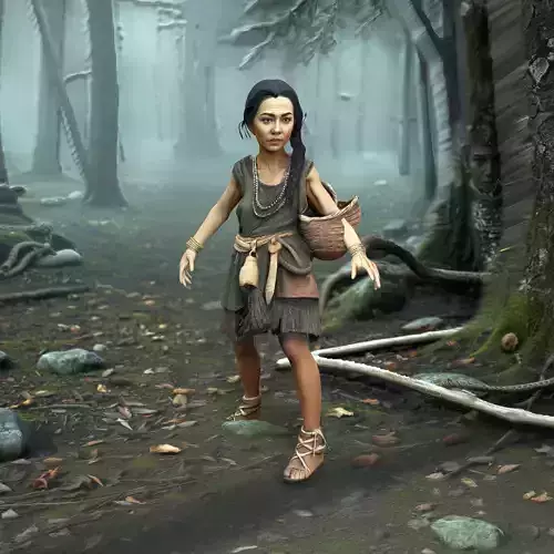 A wiry prehistoric gatherer woman with sturdy legs and a compact silhouette, weathered olive skin with sun freckles, calm sharp eyes, and a single braided hairstyle wrapped around the head; wearing a layered plant-fiber shawl over a patched hide vest, cord belt, simple bead necklace, wrapped calves, and worn moccasins with mud stains; a woven foraging basket strapped to her back and a smaller plaited satchel clipped to the belt, plus a bone needle case attached to the strap. In a forest-edge clearing with damp leaf litter, mossy rocks, and fallen birch branches under cool misty morning light; Full-body, centered, fully visible in frame; standing upright in a T-pose with arms extended straight out to the sides; palms facing the camera (open palms); hands empty; match the provided OpenPose reference; PBR-friendly materials..