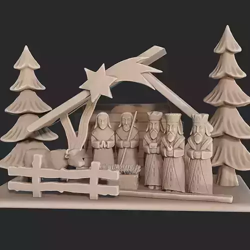 3D Nativity Scene in Wood-Carving Style – The scene includes Mary, Joseph, Baby Jesus, the Three Wise Men, and a cow inside a rustic stable. Could be used for 3D printing, it’s ideal for holiday decorations or displays.