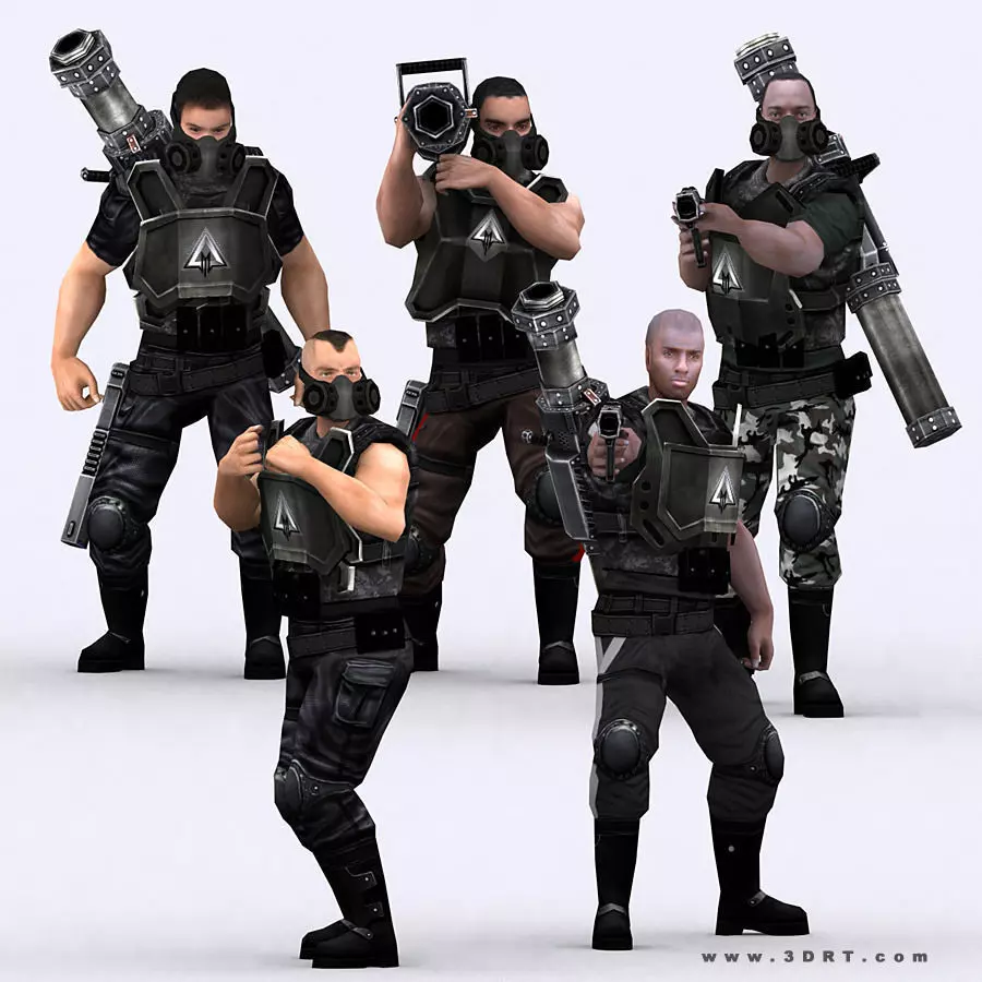 Heavy troopers 3d animated characters pack. Modular mesh, 5 removable armor plates, gas mask. 2 weapons: rocket launcher and pistol 5 texture versions 2048x2048 .tga + normal maps.