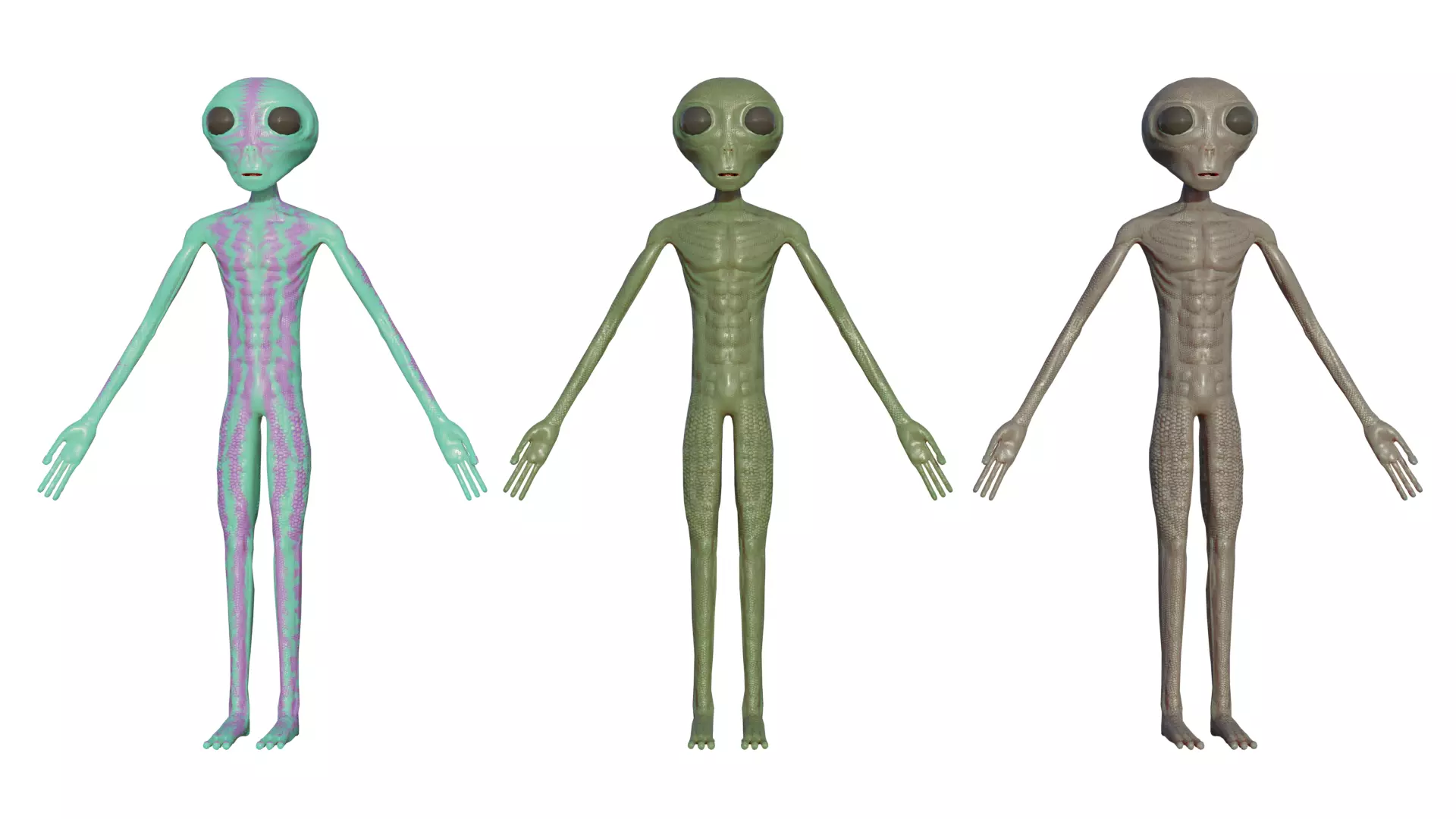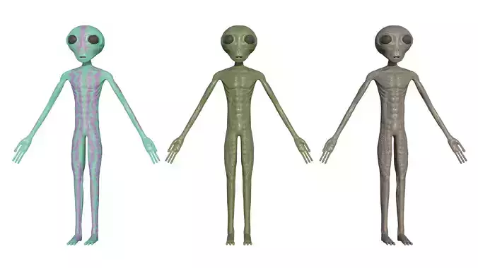 This Alien has 3 Base Colors and PBR Textures. It is really Low Poly, Rigged and ready to go into a game, movie, or an image. It is completely royalty free to use in any of your projects. I'm hoping to use it in a movie of my own one day! I have the blend file and an obj. version here, but if you are using blender you can mess around with the subsurface setting on the principled BSDF node to give it more or less of a fleshy undertone. In the pictures displayed with the white background I didn't add any just so you guys can see what it looks like with and without the subsurface. I like to change it to a dark reddish color or a dark color based off the texture color map, but it's fun to just mess around with that. I hope you all enjoy this model! Thank you all so much!