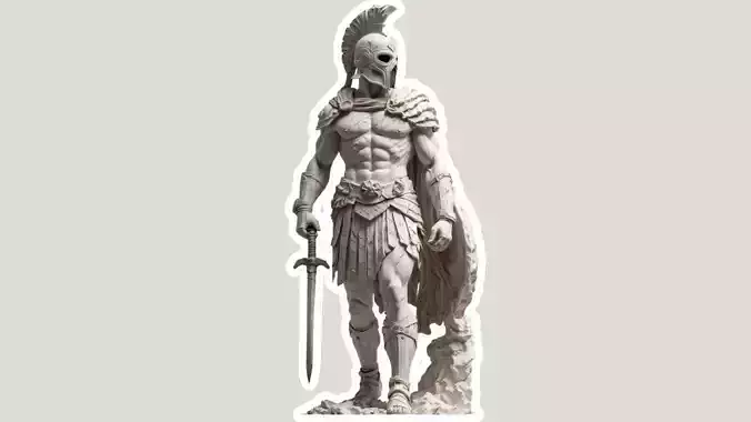 This highly detailed 3D model depicts a Spartan warrior/ancient gladiator hero in a commanding pose, complete with classical armor, plumed helmet, sword, shield, and a rugged rocky base. Designed with realistic muscular anatomy and finely sculpted details, this model captures the spirit of ancient warriors and legendary battles.