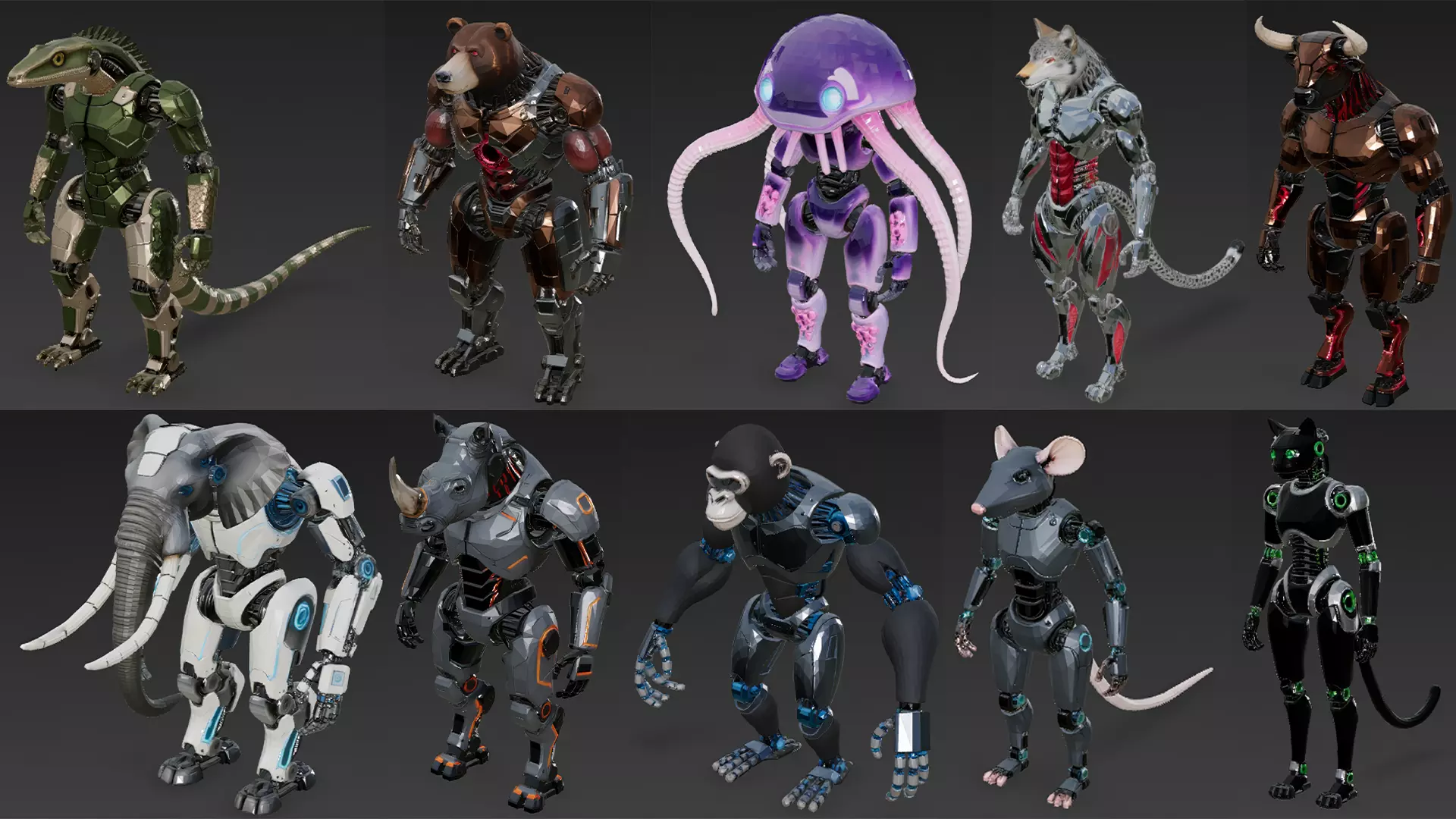 Description:A complete bundle of ten animal-inspired humanoid robots designed with a bold and diverse sci-fi mechanical aesthetic.