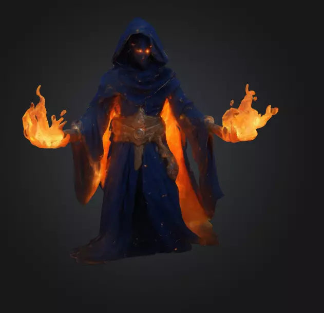 A powerful and mystical wizard stands ready for battle, clad in a flowing deep-blue robe with golden embroidery. His hood is pulled back, revealing piercing, glowing eyes filled with arcane energy. A thick leather belt secures his robe, and his sturdy boots press firmly against the ground as magical embers swirl around him.