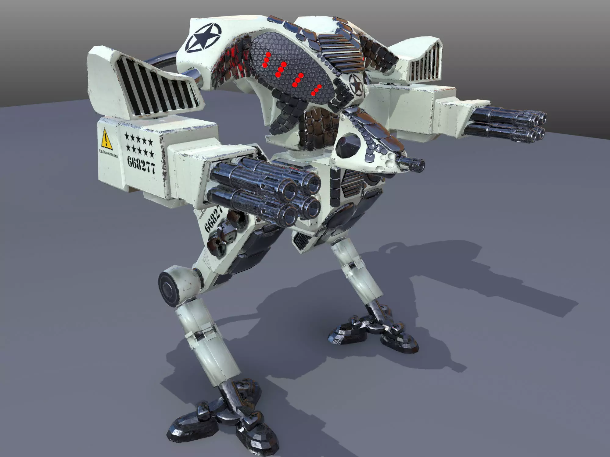 4 different color variations for mech. 3 different colors for lights (emission textures) which can be combined with any of the colors. See image comparing model with 4K texture to 1K texture