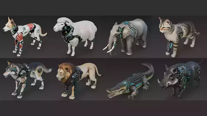 This bundle combines familiar animal forms with advanced cybernetic prosthetics and mechanical augmentations, creating a cohesive set of augmented beasts suited for dark futuristic worlds.
