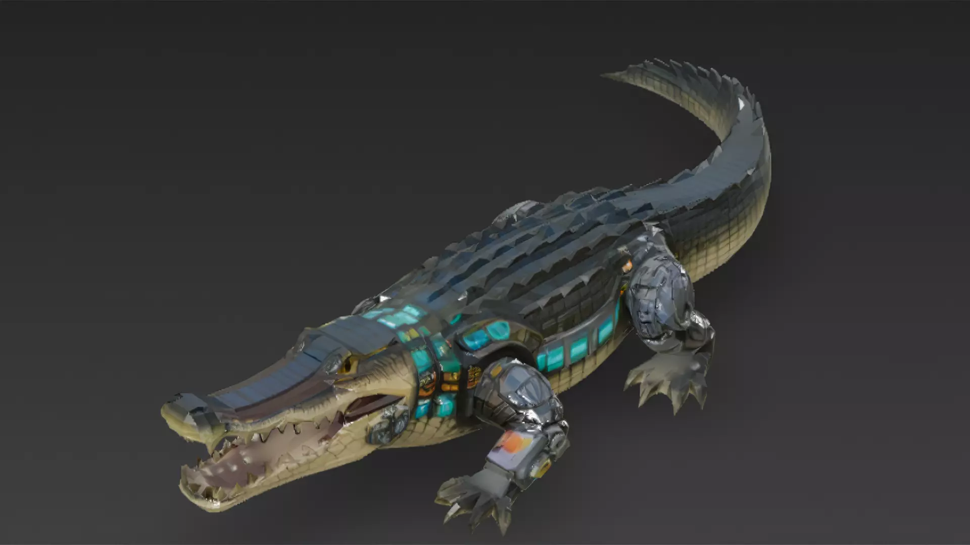The reinforced mechanical limbs, armored cyber plating, and exposed biomechanical components make this crocodile ideal as a cyberpunk apex predator, experimental combat beast, or boss-level enemy in sci-fi games, animations, and cinematic projects. It fits perfectly into dystopian swamps, industrial waterways, cyberpunk cities, or post-apocalyptic environments.