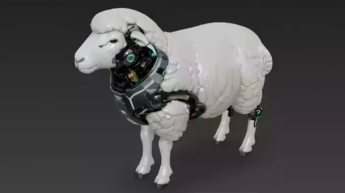 This 3D model contrasts the gentle, familiar form of a sheep with advanced cybernetic prosthetics, creating an unsettling yet memorable augmented creature.