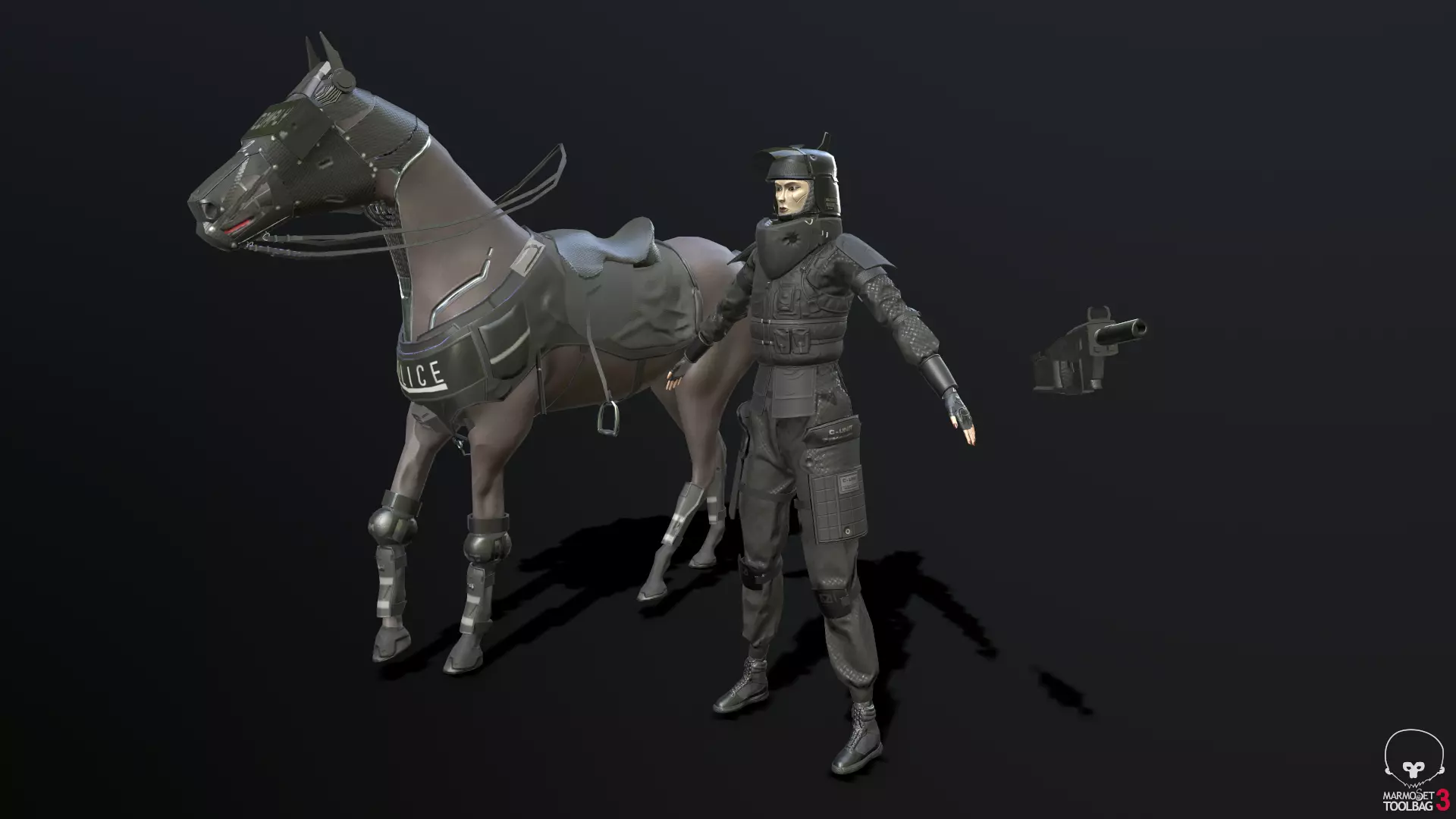 This is the result. The model has even fewer polygons, and two material slots (Rider and Horse) and is rigged and ready for animation.
