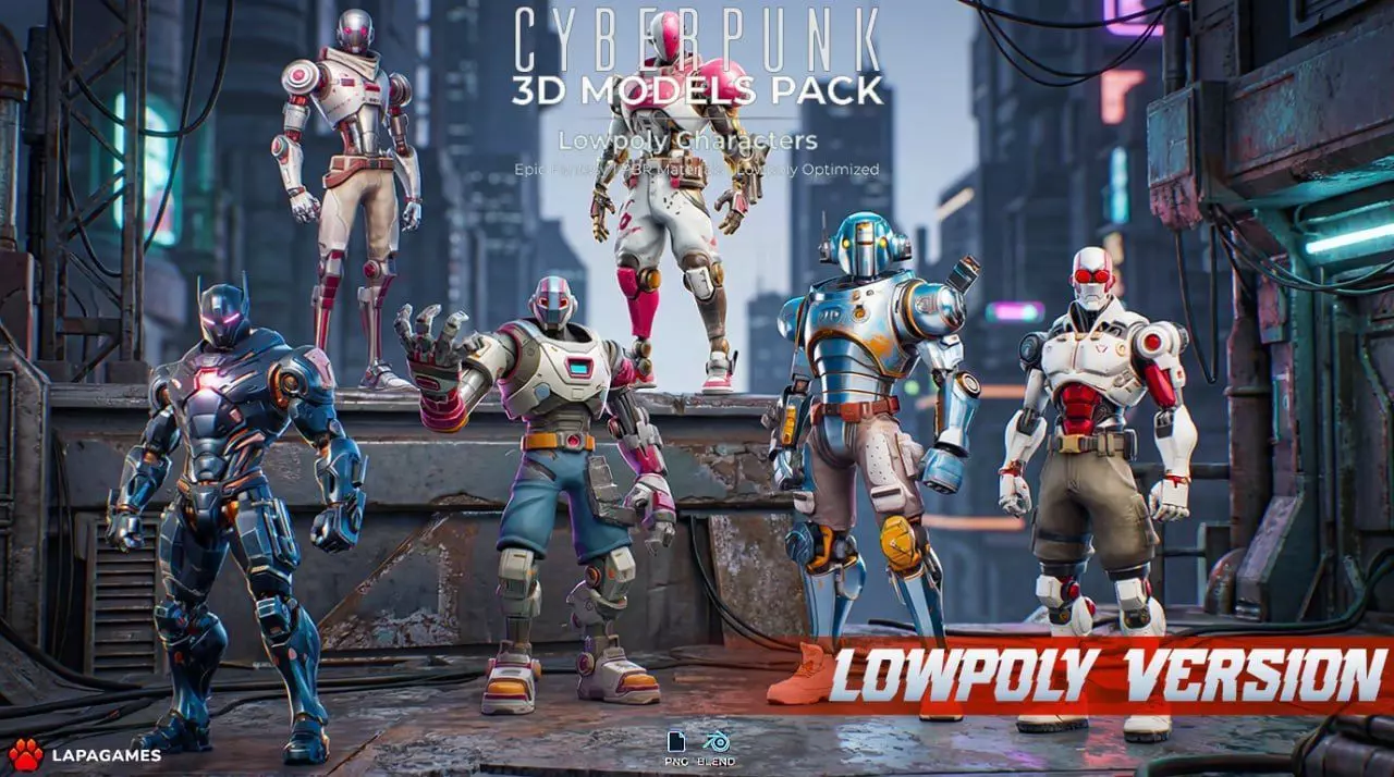 Stylized lowpoly robot charactersCyberpunk combat android designsHeavy armored silhouettesDistinct color variationsGame-ready topologyOptimized for real-time useEasy to adapt for different roles (enemy, boss, NPC)