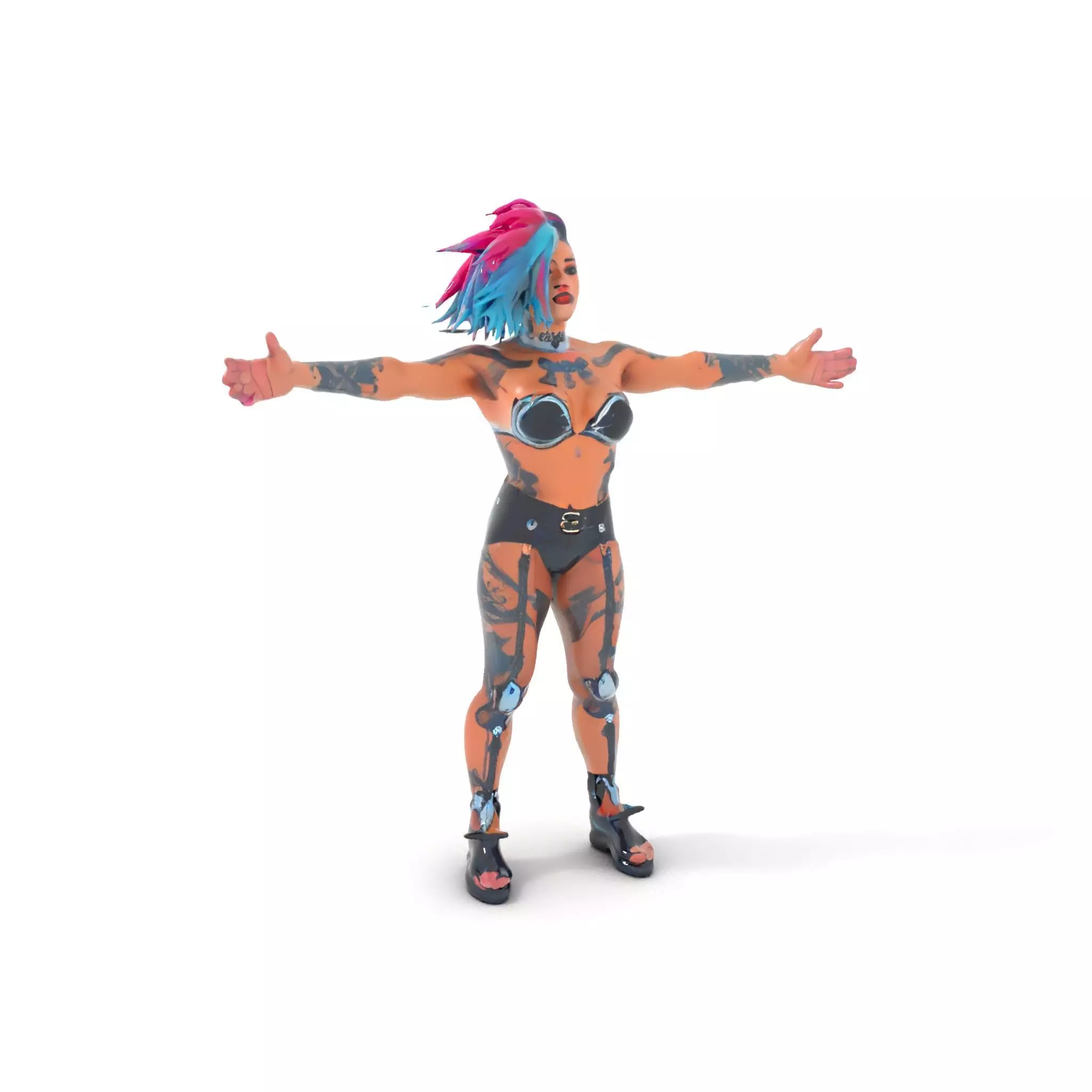The Cyberpunk Tattooed Model Pack features a futuristic character with vibrant hair and intricate tattoos, ideal for sci-fi environments or futuristic games. Perfect for cyberpunk worlds, VR experiences, or digital art projects.
