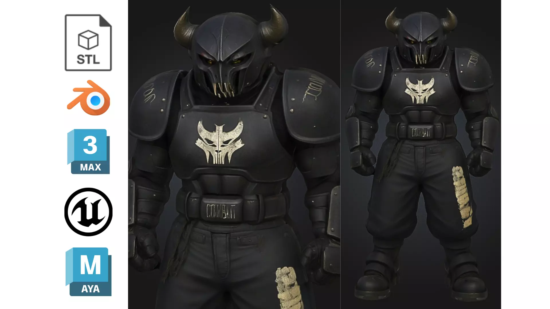 This fearsome 3D character model showcases a heavily armored warrior with a demonic aesthetic. Featuring a black horned helmet, sinister glowing eyes, and a reinforced torso marked by a white skull emblem, the design exudes strength and intimidation. With bulky shoulder pads, rugged gloves, and torn pants, this model is perfect for gritty or post-apocalyptic scenes.