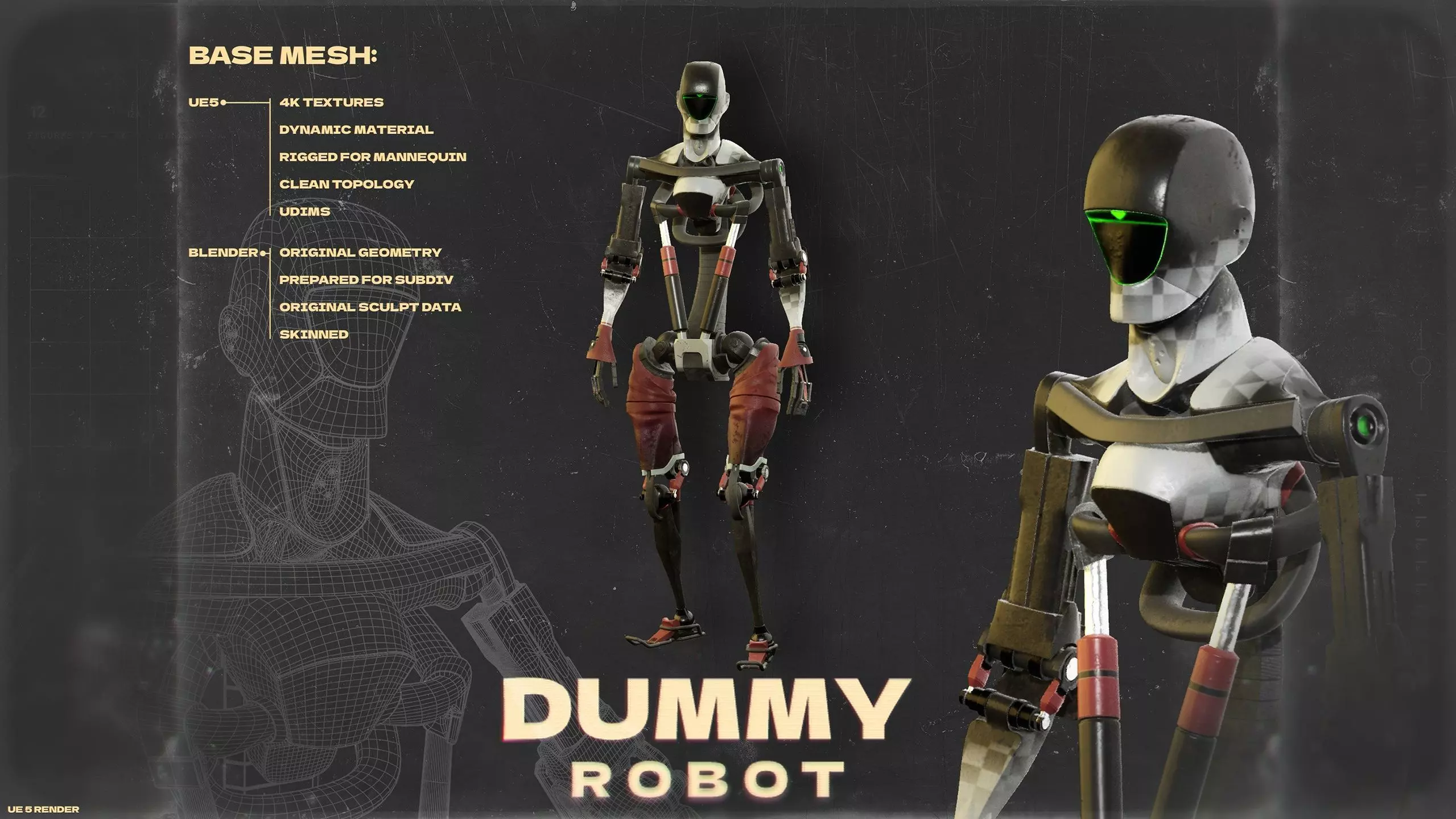 DUMMY robot is a meticulously crafted asset for any possible production scenario. With 4K textures and the inclusion of original subdivided meshes, you can be sure that your cinematic and video game will be in AAA quality from start to finish.
