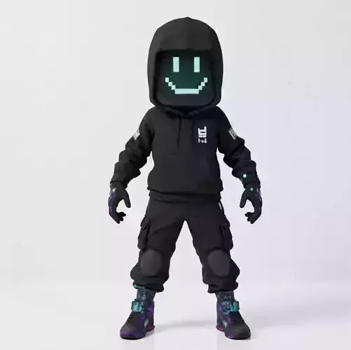 Description: Dive into the digital realm with this ultra-cool Digital LED Face Hacker 3D Model. This character perfectly captures the modern cyberpunk aesthetic, featuring a high-tech helmet with a customizable LED screen face displaying a pixelated smiley. He is dressed in trendy urban tactical gear, including an oversized black hoodie with white decal logos, baggy cargo pants with knee pads, and high-top sneakers splashed with galaxy-colored paint. The glowing teal pixels on his face and the subtle emissive details on his gloves give him a tech-savvy, mysterious vibe, making him an excellent avatar for metaverse apps, rhythm games, or futuristic RPGs.