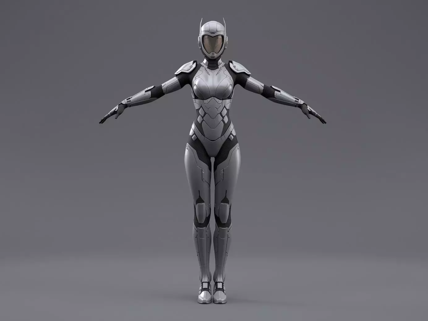 TagsArmor SciFi Female Crusader HeavyDuty Combat Tpose Character Prop GameAsset Dystopian Futuristic Matte Gray Military Robot Warrior Enclosed Mecha Asset