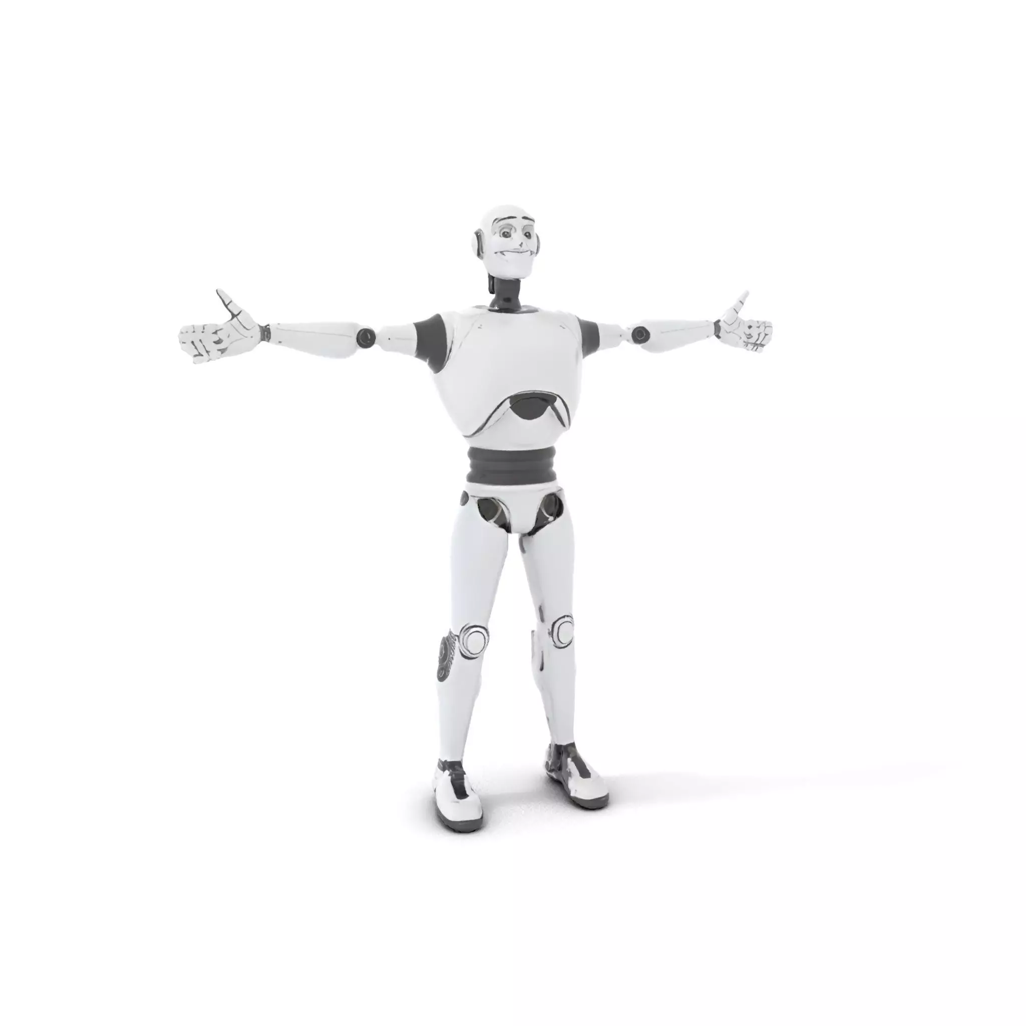 This 3D model depicts a friendly white robot with a modern design and communicative pose, ideal for futuristic animations, robotics simulations, or educational applications. Each model has 3 levels of detail: low-poly (1000 triangles for mobile), middle-poly (10,000 triangles for environment), and high-poly (100,000 triangles), which allows for the use of this model in production rendering (such as 3ds Max, Maya, Cinema 4D, Blender, Vray/Corona/Cycles and all other), game engines (Unity and Unreal compatible), and interactive presentations, providing a choice of detail based on the LOD System principle. The model's textures are PBR, Diffuse, NormalMap, and reflection/roughness/metallic, which are suitable for any modern rendering engine. All models accurately unwrapped and have no overlapping UV. All textures are 4096*4096 in size. If you like this model, please leave a comment or like it!