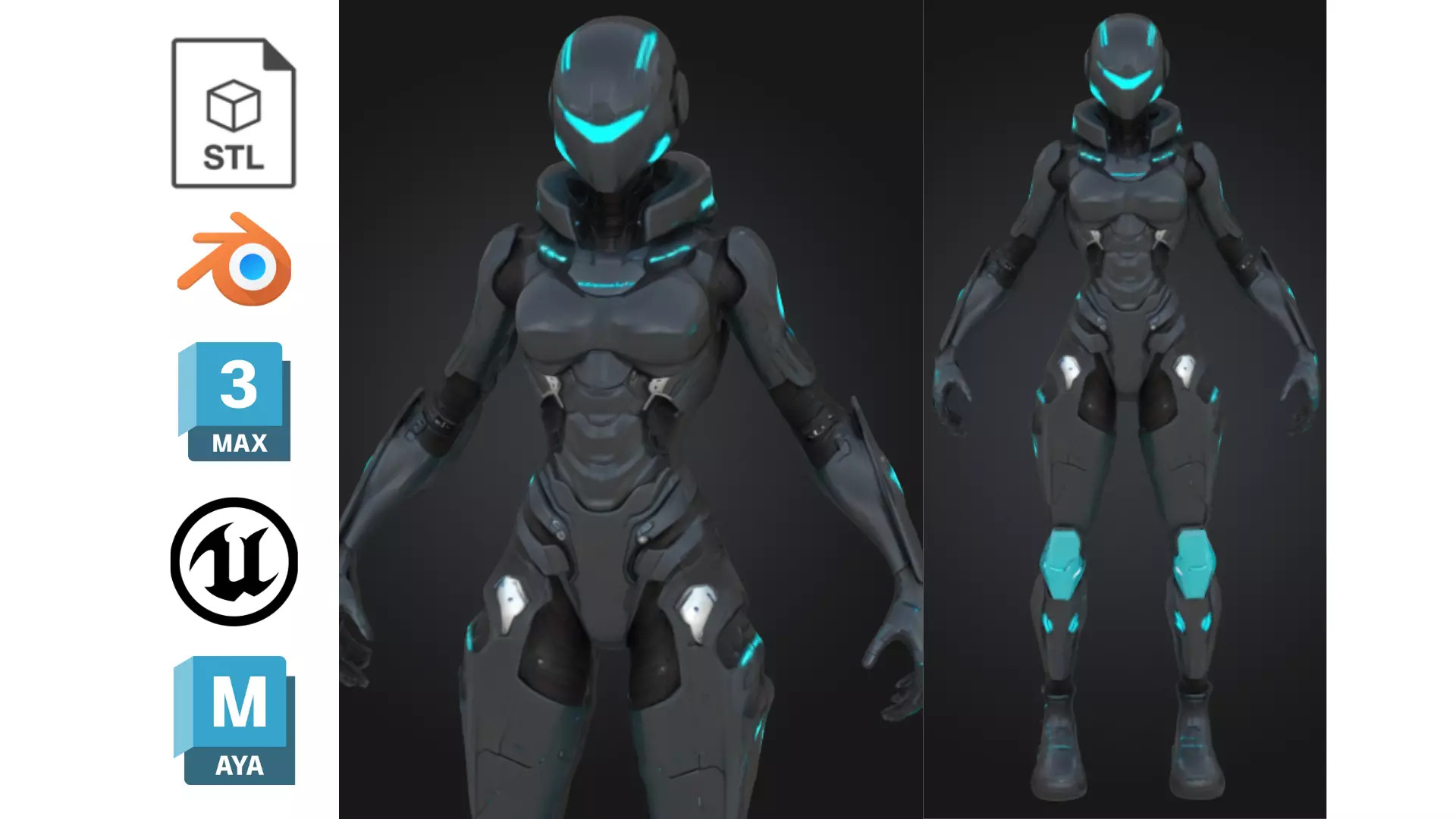 Introducing a futuristic female sci-fi warrior built for high-end game or cinematic production. Clad in a sleek black and blue emissive mech suit, this character features an armored exoskeleton with glowing visor and integrated circuitry — ideal for roles as a hero, agent, or futuristic soldier.