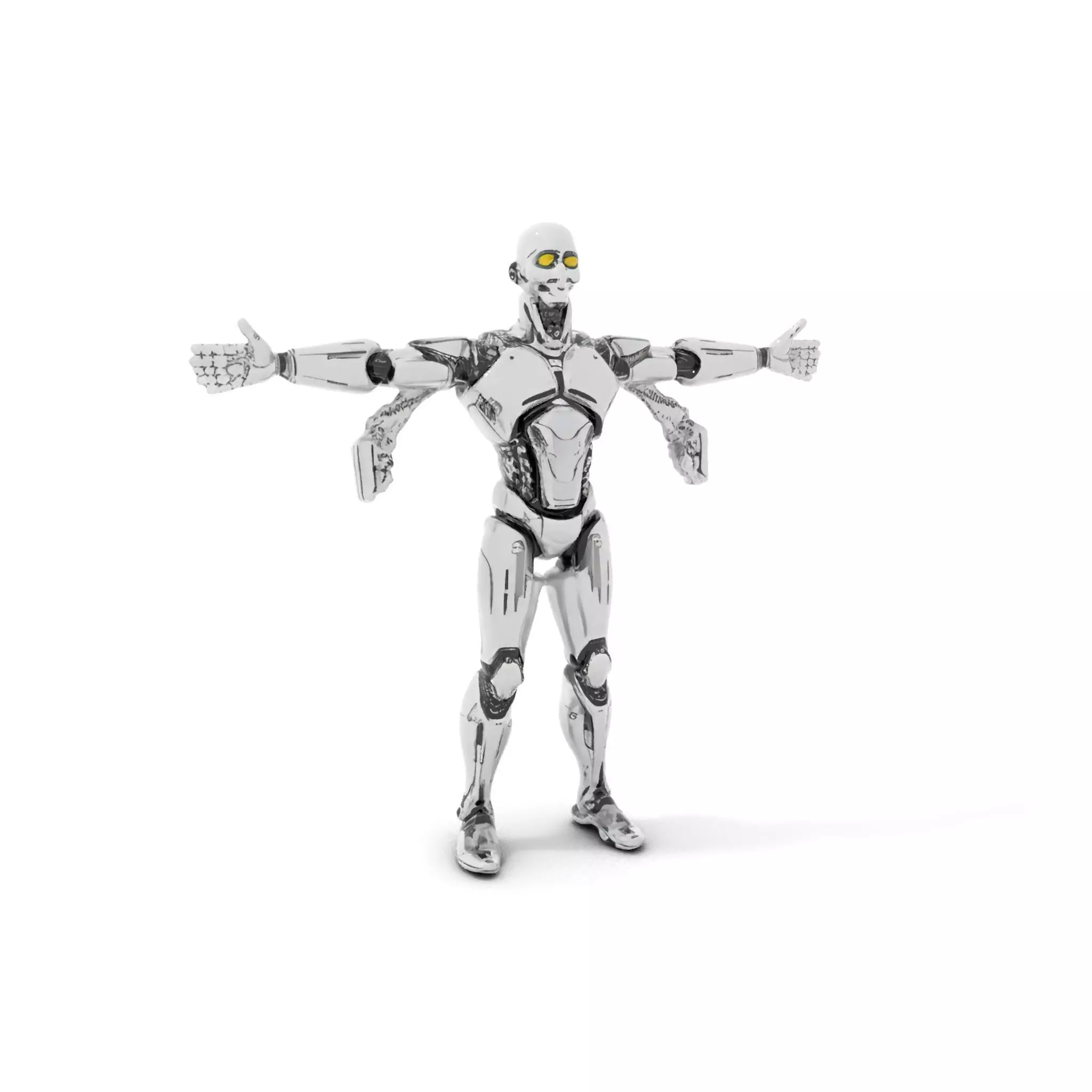 This futuristic humanoid robot model features a sleek, metallic aesthetic with detailed articulations. Each model has 3 levels of detail: low-poly (1000 triangles for mobile), middle-poly (10,000 triangles for environment), and high-poly (100,000 triangles), which allows for the use of this model in production rendering (such as 3ds max, Maya, Cinema4D, Blender, Vray/Corona/Cycles, and all others), game engines (Unity and Unreal compatible), and interactive presentations, providing a choice of detail based on the LOD System principle. Ideal for sci-fi films, video games, and robotics presentations. The model's textures are PBR, Diffuse, NormalMap, and reflection/roughness/metallic, which are suitable for any modern rendering engine. All models accurately unwrapped and have no overlapping UV. The first image is the reference used for creating the 3D model. It is important to carefully evaluate the quality of the model by examining the preview images that display the topology and polygonal mesh. These previews (WIRE and WEB 3D Preview) clearly demonstrate how accurately the model matches the original reference and how well the geometry has been executed. All textures are 4096*4096 in size. If you liked the model, please leave a like and comment.