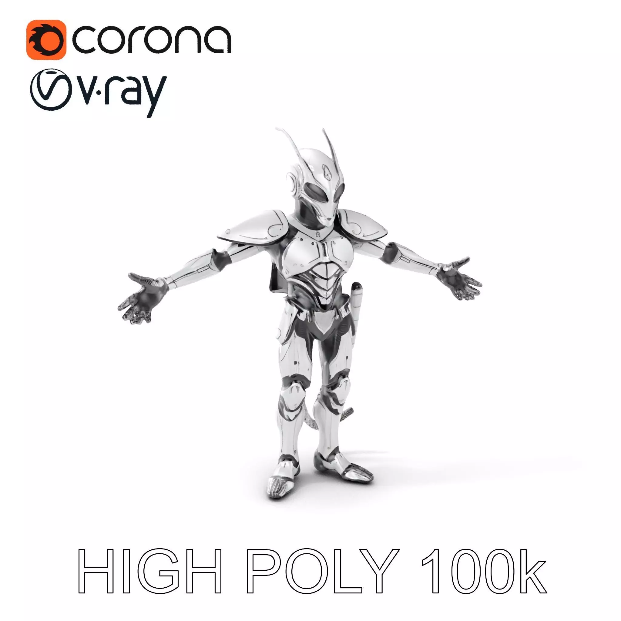 This 3D model pack features a highly detailed futuristic insectoid warrior, perfect for sci-fi game environments, animations, and visual effects. Each model comes with three levels of detail: low-poly (1000 triangles) for mobile, middle-poly (10,000 triangles) for environments, and high-poly (100,000 triangles) for production rendering. Textures include PBR, Diffuse, NormalMap, and reflection/roughness/metallic, all at 4096x4096 resolution, suitable for any modern rendering engine. The models have no overlapping UVs and are available for use in 3ds Max, Maya, Cinema4D, Blender, Vray, Corona, Cycles, Unity, and Unreal. Ideal for creating immersive sci-fi scenes or interactive presentations. The first image is the reference used for creating the 3D model. It is important to carefully evaluate the quality of the model by examining the preview images that display the topology and polygonal mesh. These previews (WIRE and WEB 3D Preview) clearly demonstrate how accurately the model matches the original reference and how well the geometry has been executed. If you like this model, please leave a like and comment.