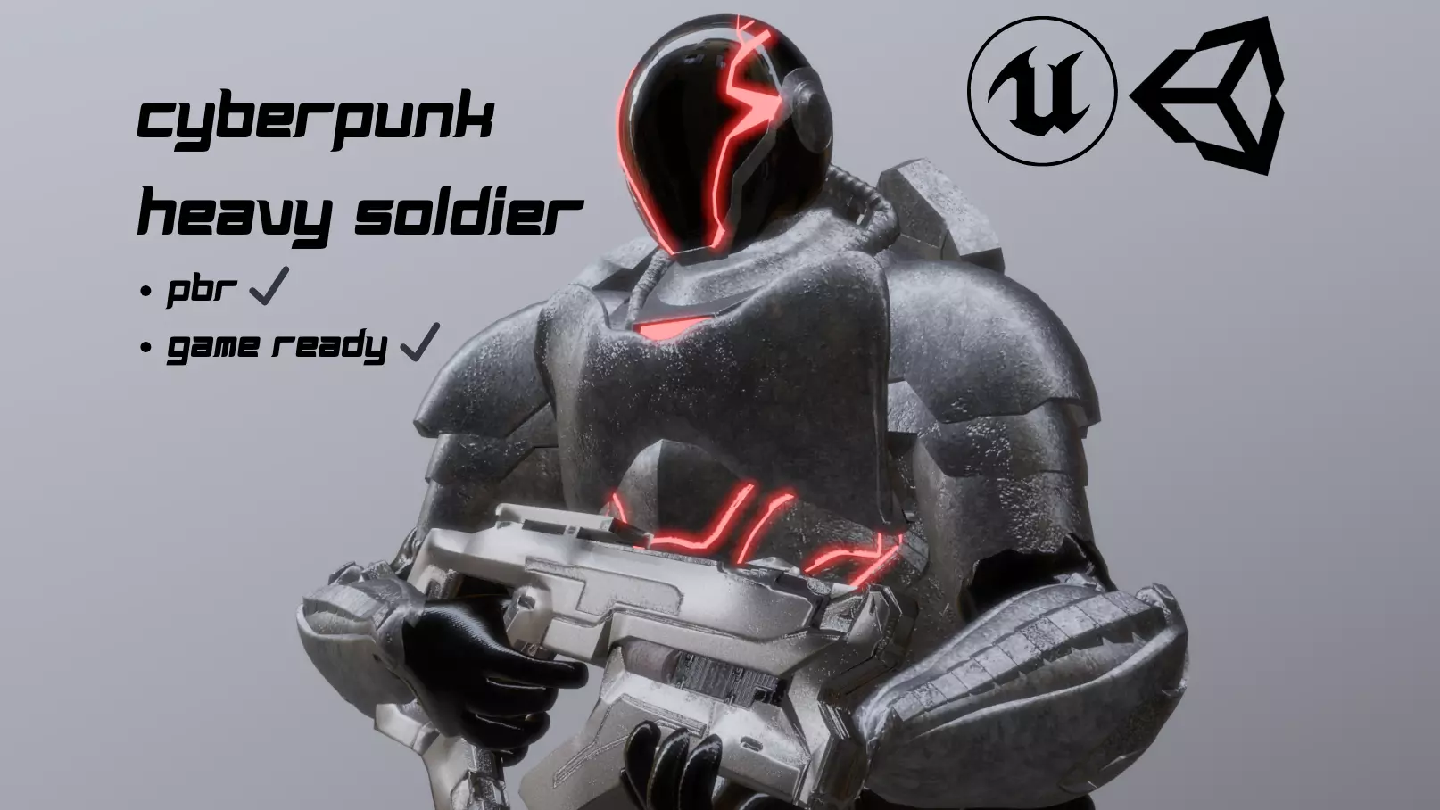 Designed for Cinematic Renders, Concept Art, and Next-Gen Game Engines (Unity HDRP / Unreal Engine 5). The character features a heavy cybernetic exoskeleton design with customizable emissive details, perfect for roles like Mech Pilot, Space Marine, or Elite Enforcer where visual quality is the priority.