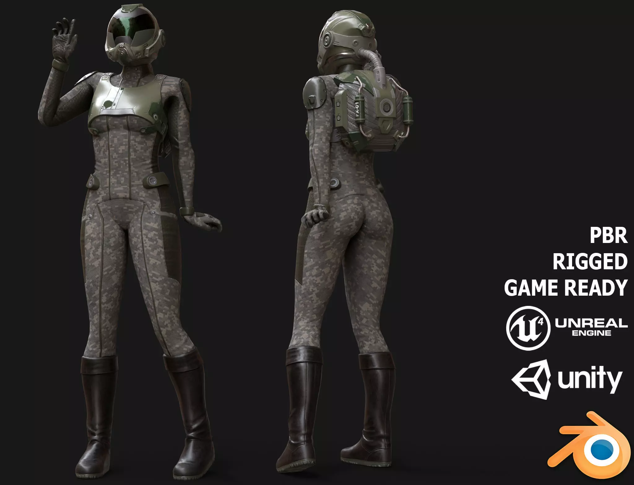 FX01 Female Sci-Fi Suit low-poly 3d model ready for Virtual Reality (VR), Augmented Reality (AR), games and other real-time apps.