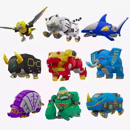 GaoKing – Ultra Knight is a low-poly transforming mecha made from 9 individual animal zords. Each zord is highly articulated and designed to combine into a fully rigged GaoKing ultra knight form.