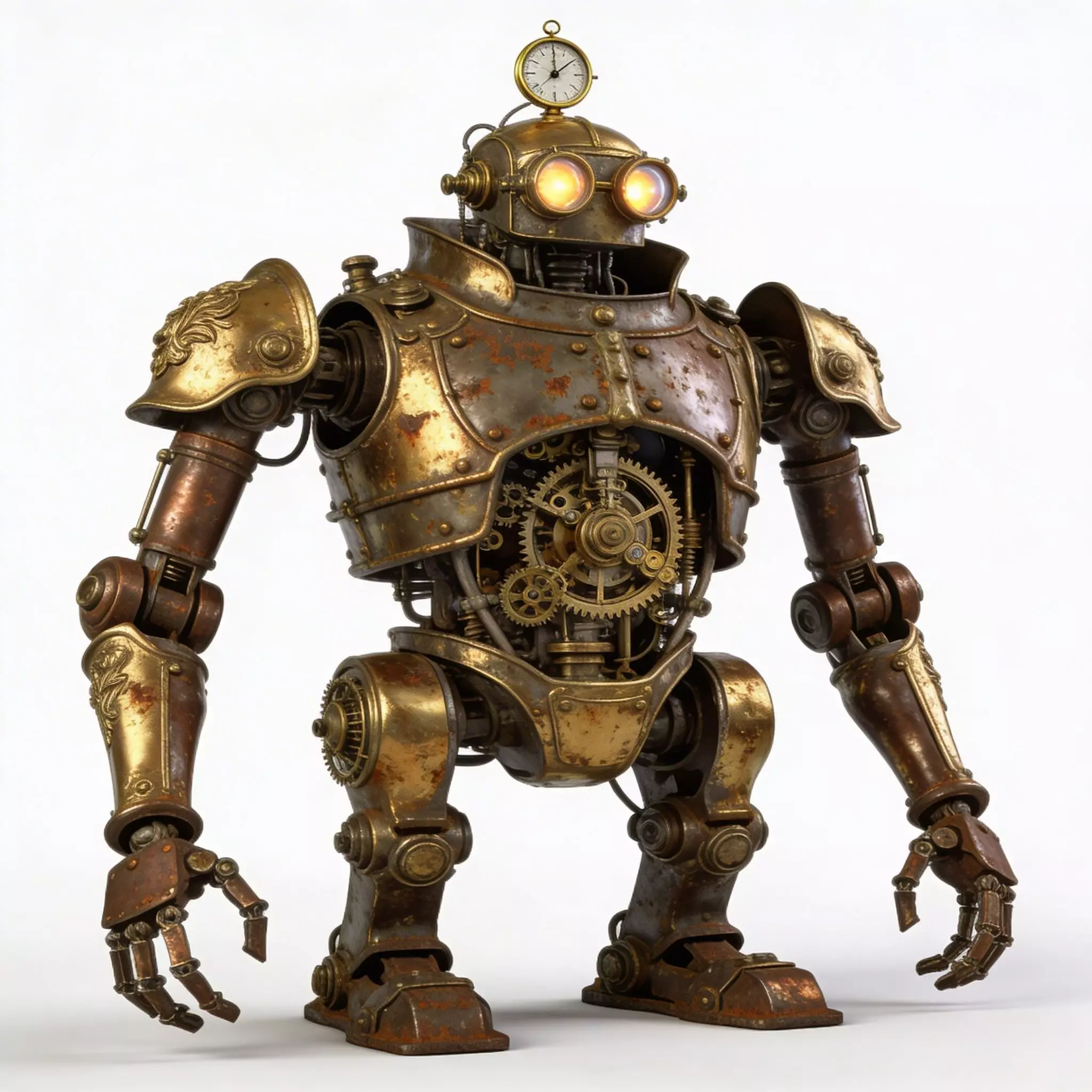 Presented on a pure white background, emphasizing the detailed surface weathering, the rich metallic textures, and the mechanical complexity of the joints.