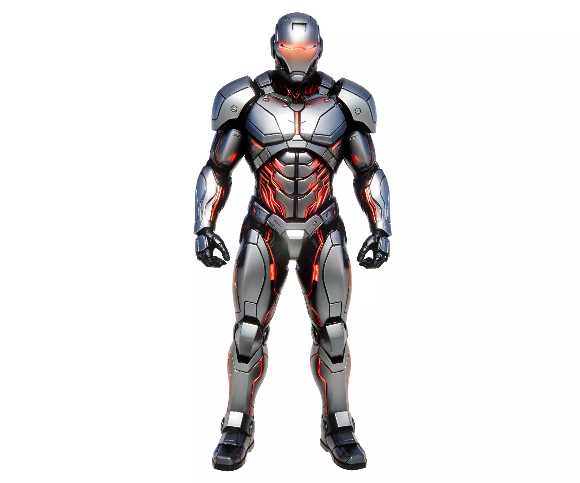 This is a Glowing Red Male Combat Mech Suit, a high-detail 3D asset optimized for animation production, digital art creation, high-end collectible figure design, and sci-fi themed brand visual content development. This futuristic full-body combat armor features a premium brushed metallic silver finish, striking glowing red circuit accents that trace its anatomical armored structure, a fully enclosed tactical helmet with an illuminated gradient visor, and precision-engineered segmented plating. Its rugged, combat-ready silhouette balances intricate mechanical detailing with a sleek, imposing futuristic design, making it ideal for sci-fi digital projects, premium collectible design, and high-quality character art creation.