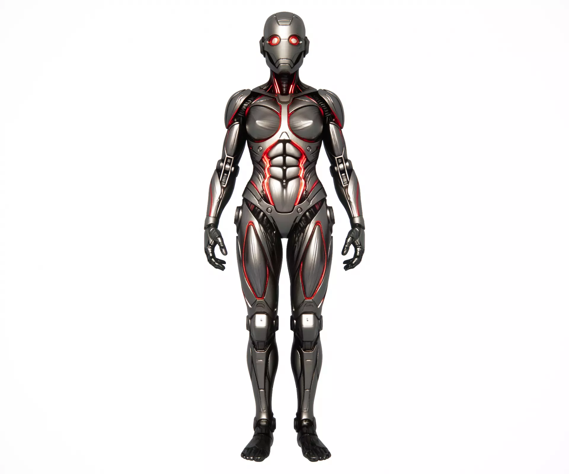 This is a Glowing Red Metallic Female Android, a high-detail 3D asset optimized for animation production, digital art creation, high-end collectible figure design, and sci-fi themed brand visual content development. This futuristic humanoid robot features a premium brushed metallic finish, striking glowing red circuit accents that trace its anatomical mechanical structure, fully articulated mechanical joints, and a streamlined helmet with matching glowing red optical lenses. Its sleek, cyberpunk-inspired silhouette balances intricate mechanical detailing with a refined humanoid design, making it ideal for sci-fi digital projects, premium collectible design, and high-quality character art creation.